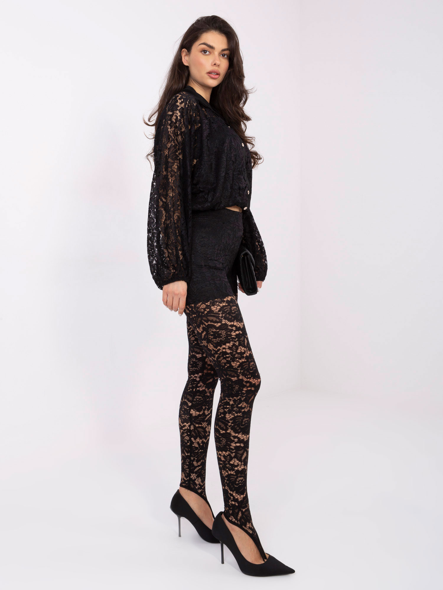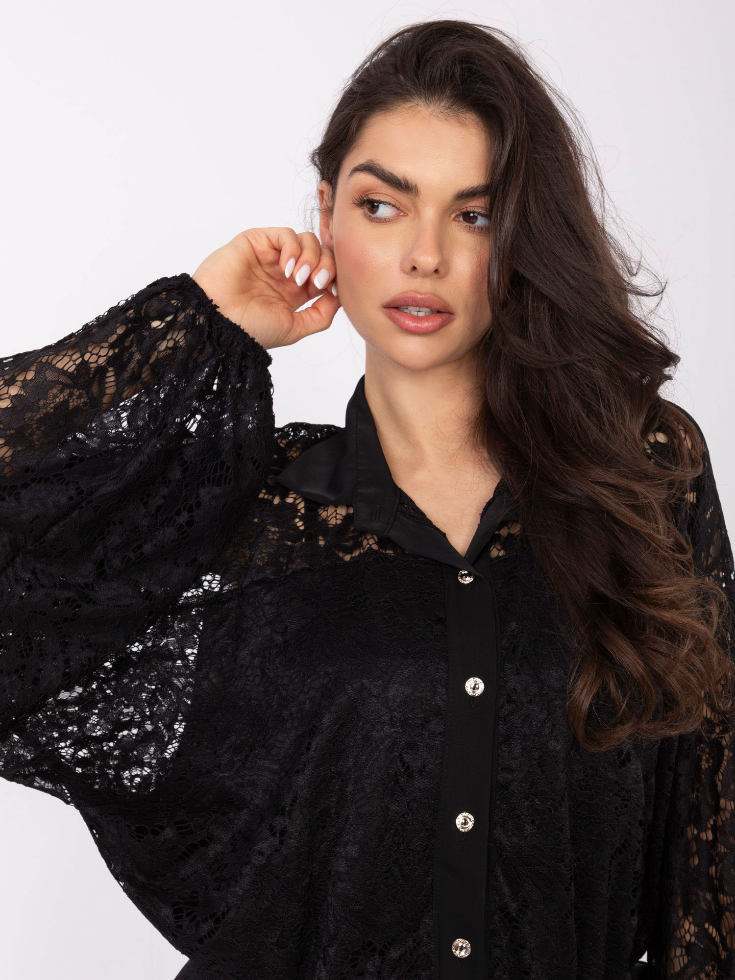 Czarna koronkowa koszula z bufiastym rękawem .