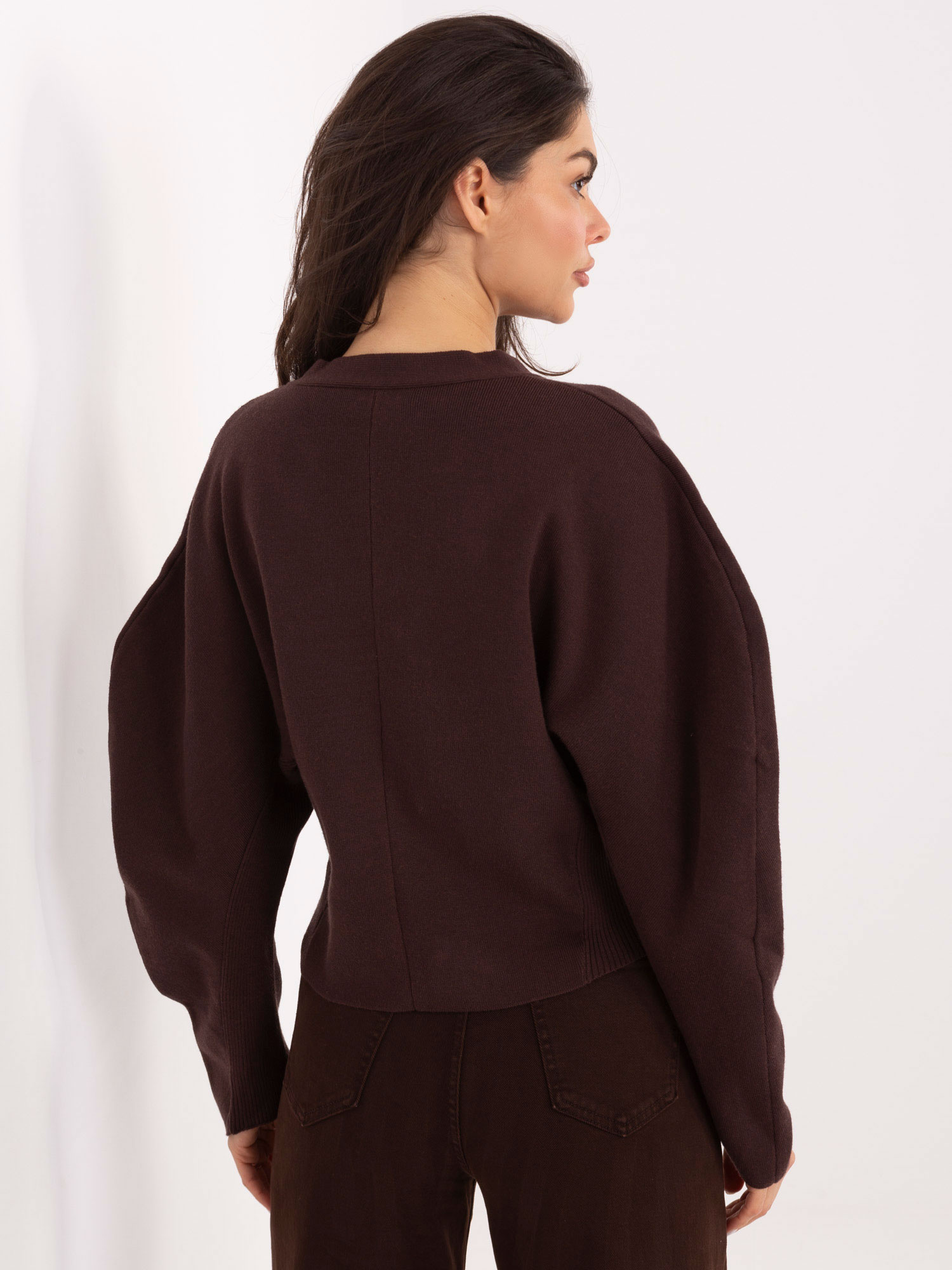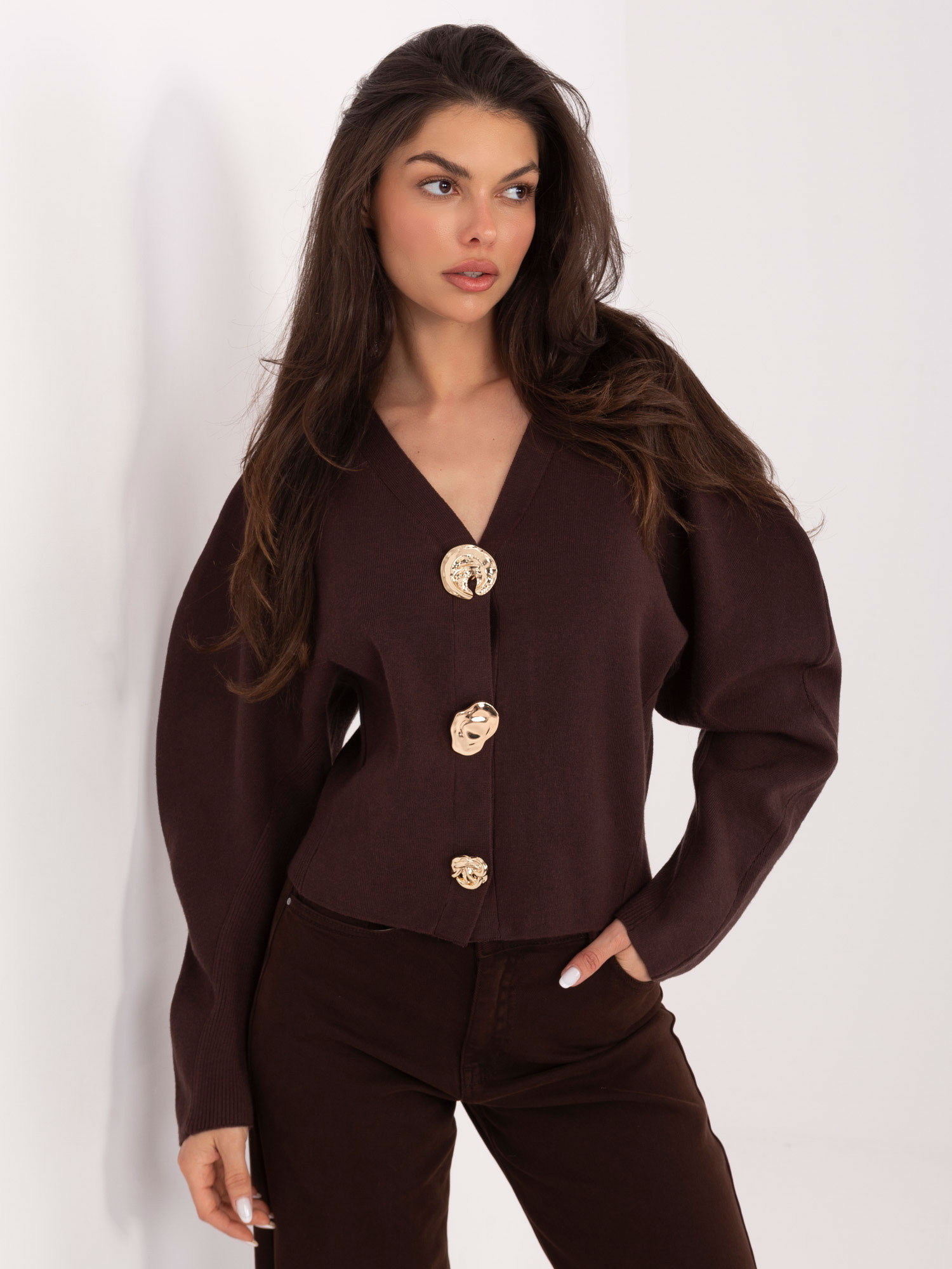 Czekoladowy sweter z zapięciem na zatrzaski .