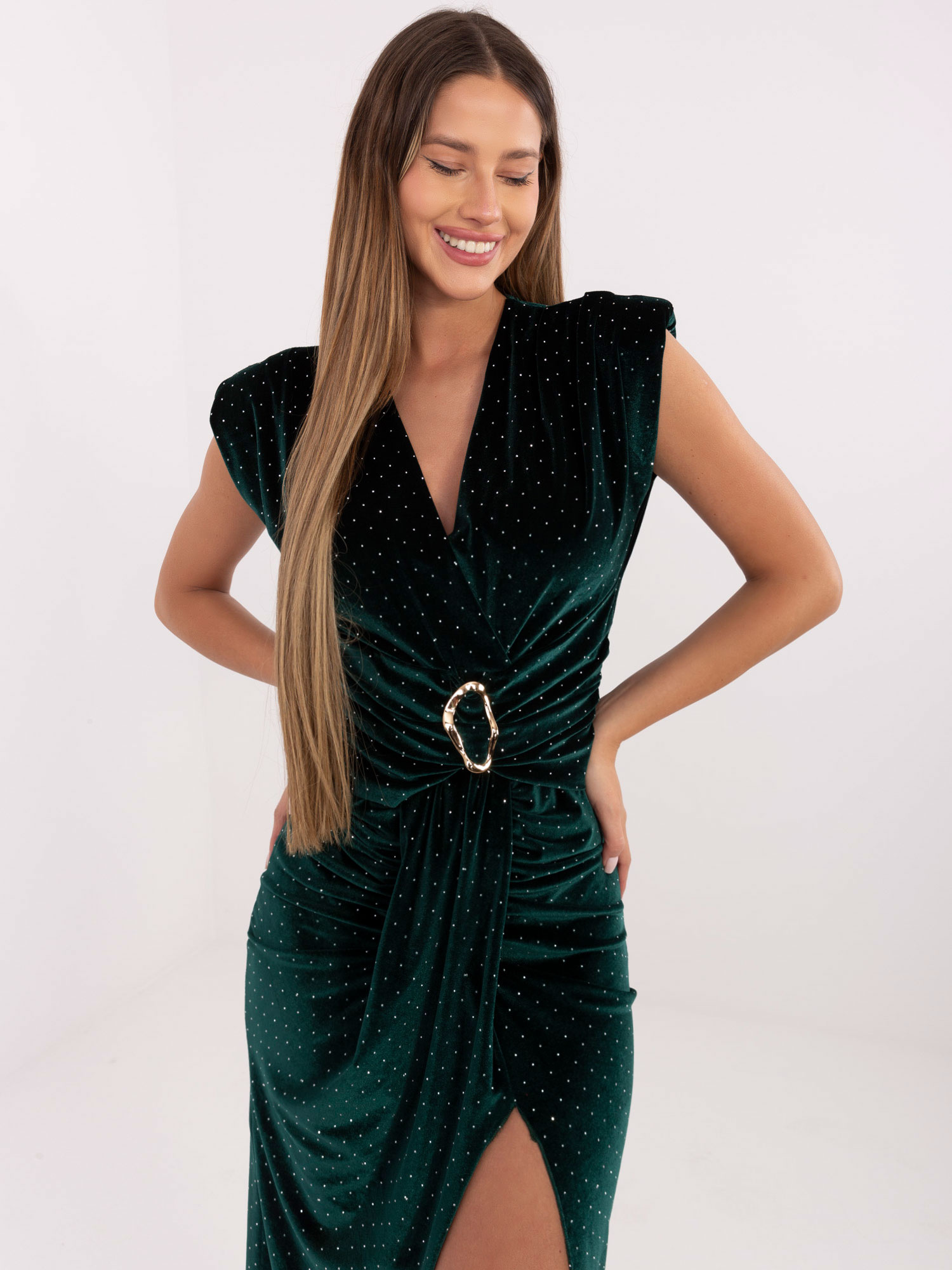 Ciemnozielona welurowa sukienka z ozdobnym detalem