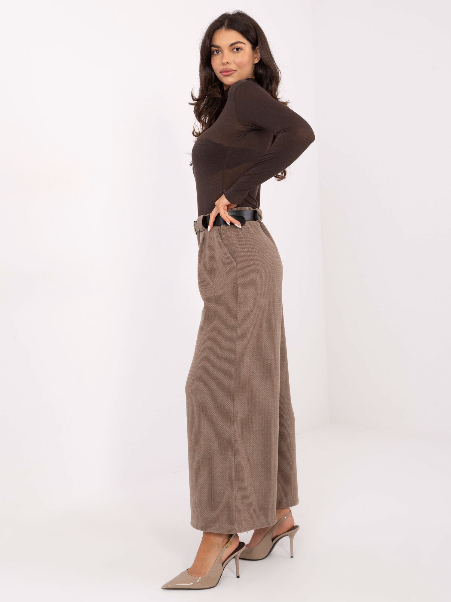 Ciemnobeżowe sztruksowe spodnie z kieszeniami RUE PARIS .