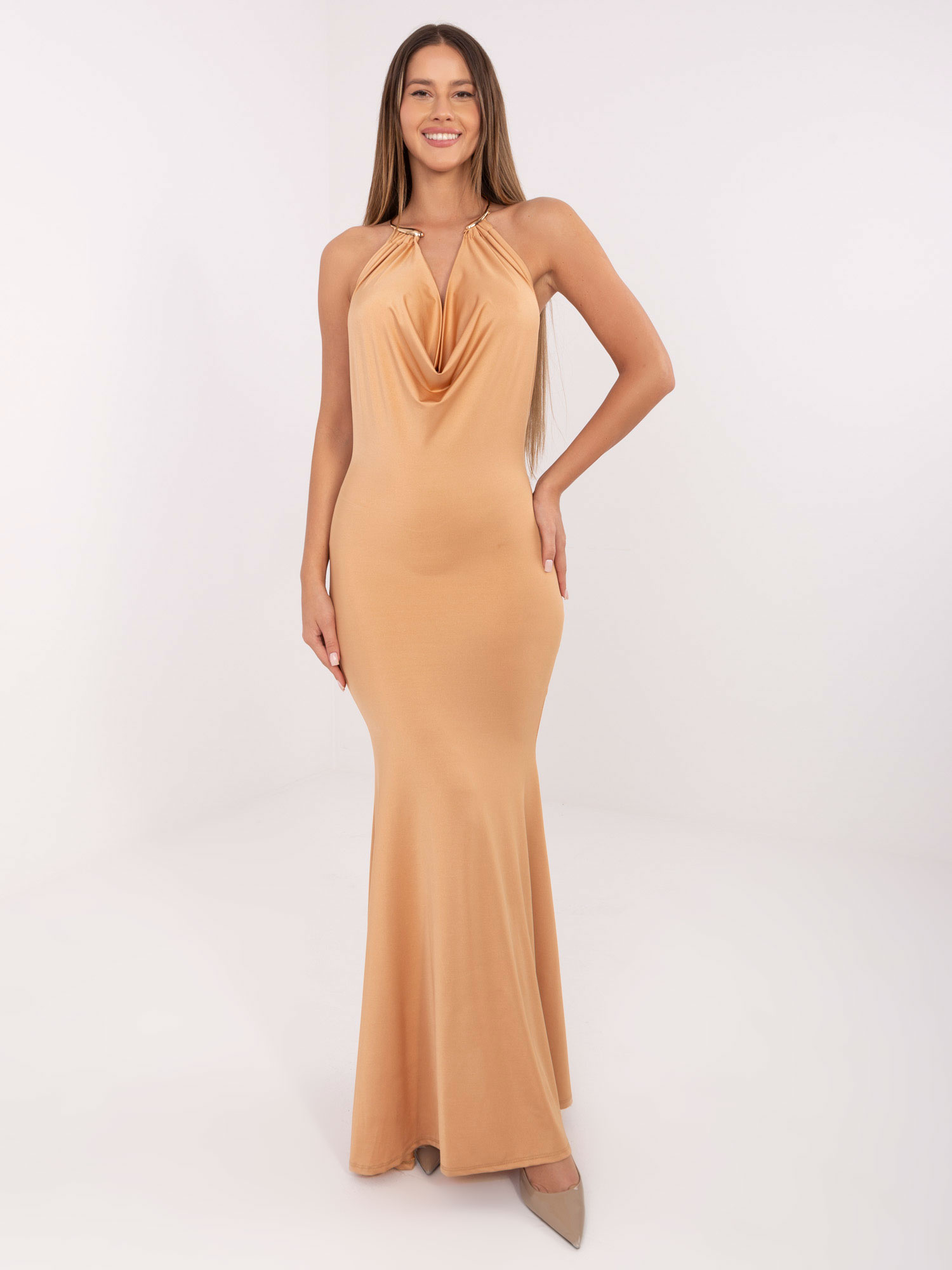 Camelowa wieczorowa sukienka z odkrytymi plecami .