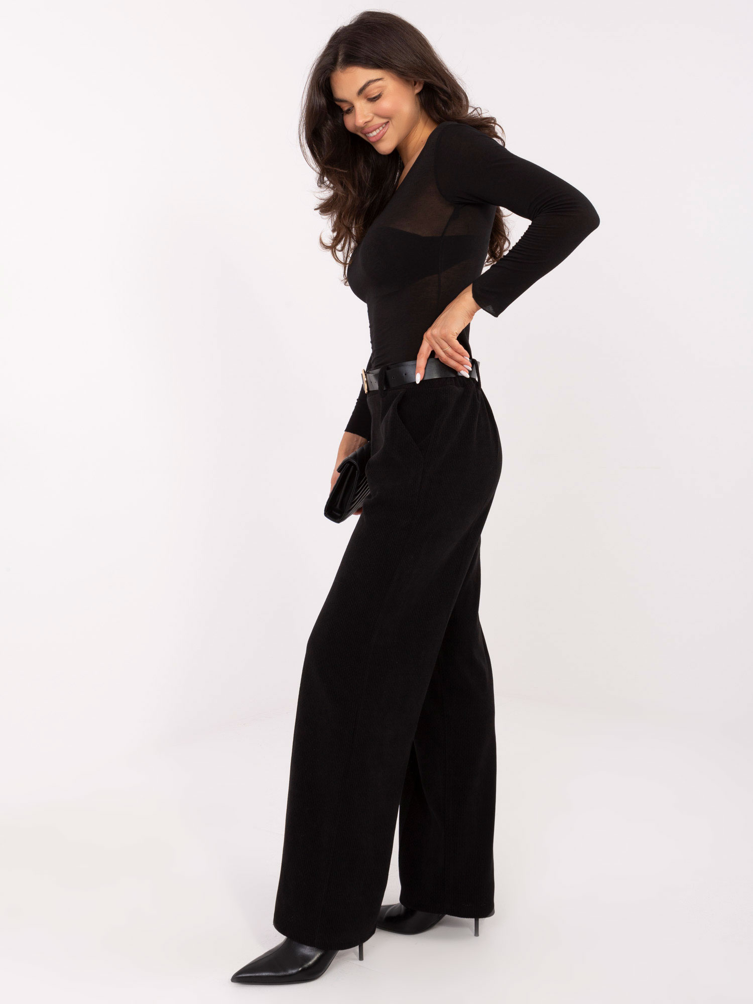 Czarne sztruksowe spodnie z szeroką nogawką .
