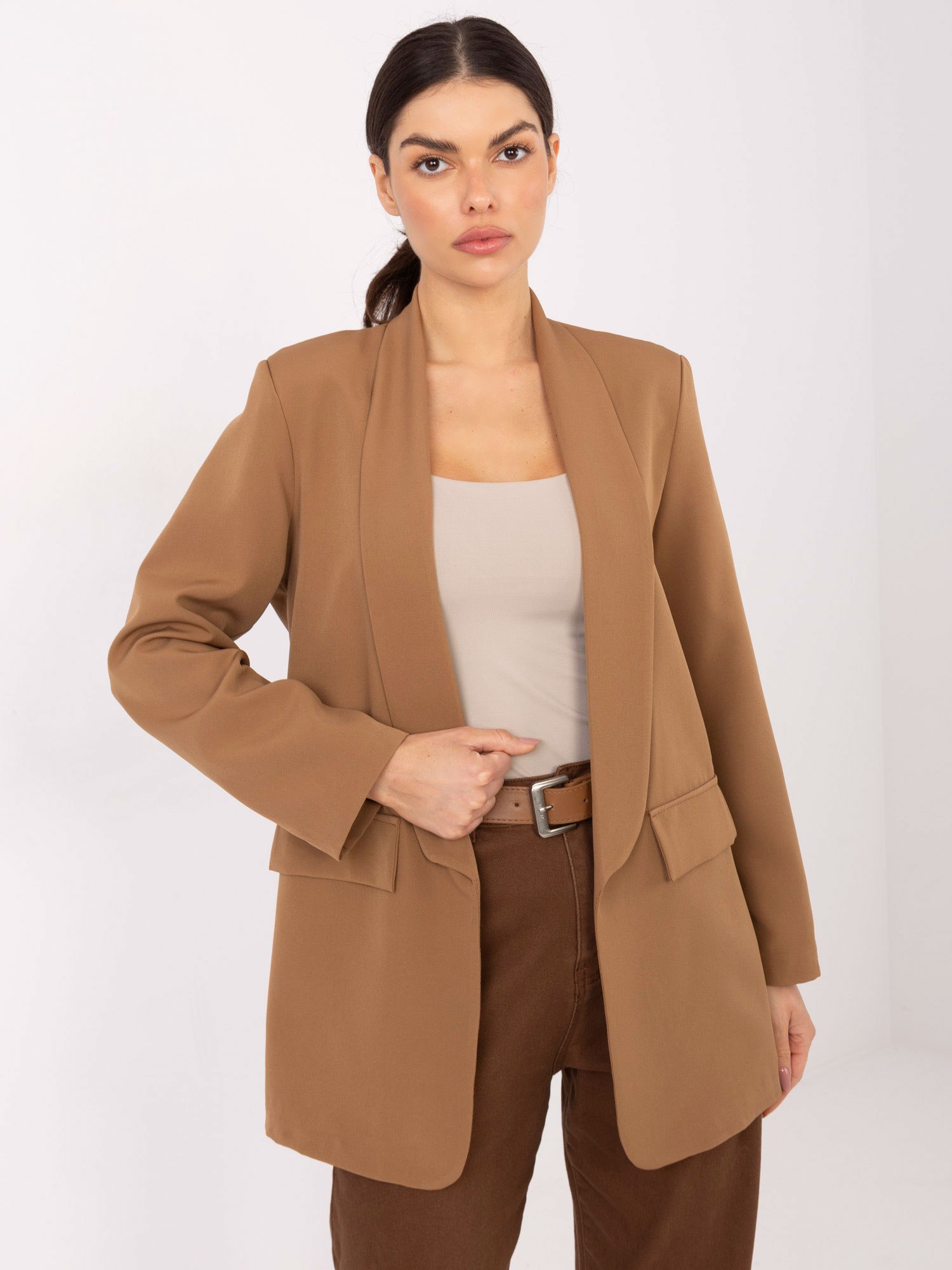 Camelowa marynarka z poduszkami na ramionach .