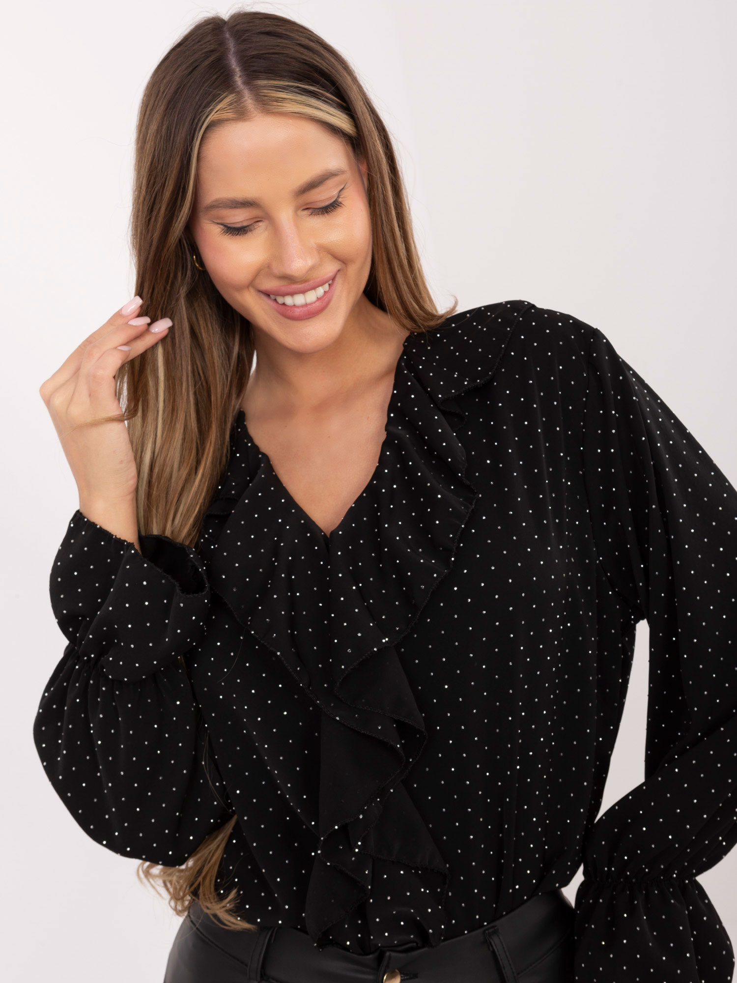 Wymiary bluzki w rozmiarze one size: szerokość pod pachami - 60 cm, długość rękawa - 59 cm (od szwu), szerokość na dole - 64 cm, długość całkowita - 65 cm.