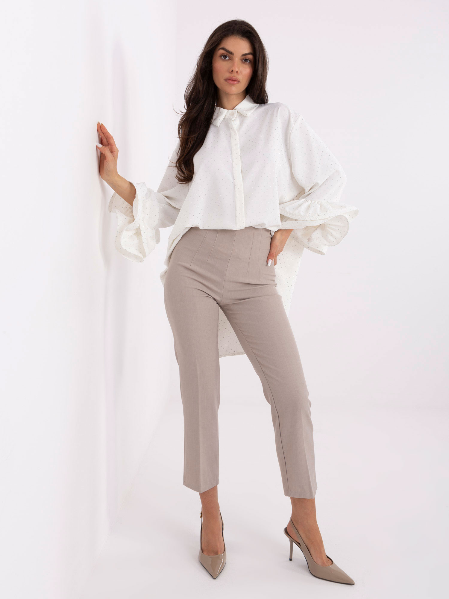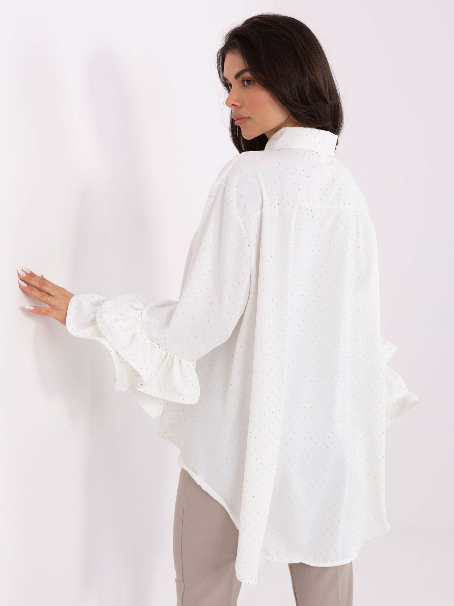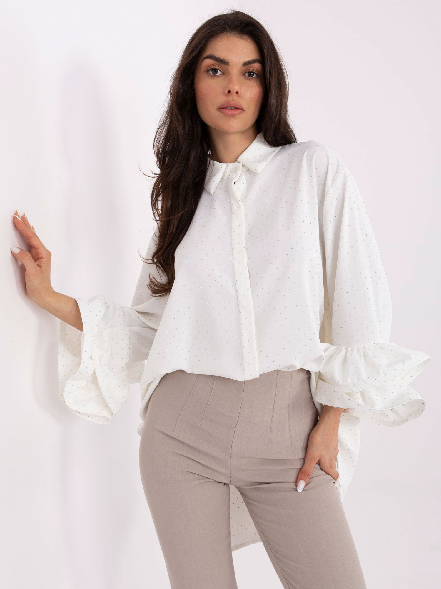 Ecru wizytowa koszula z falbanami przy rękawach .
