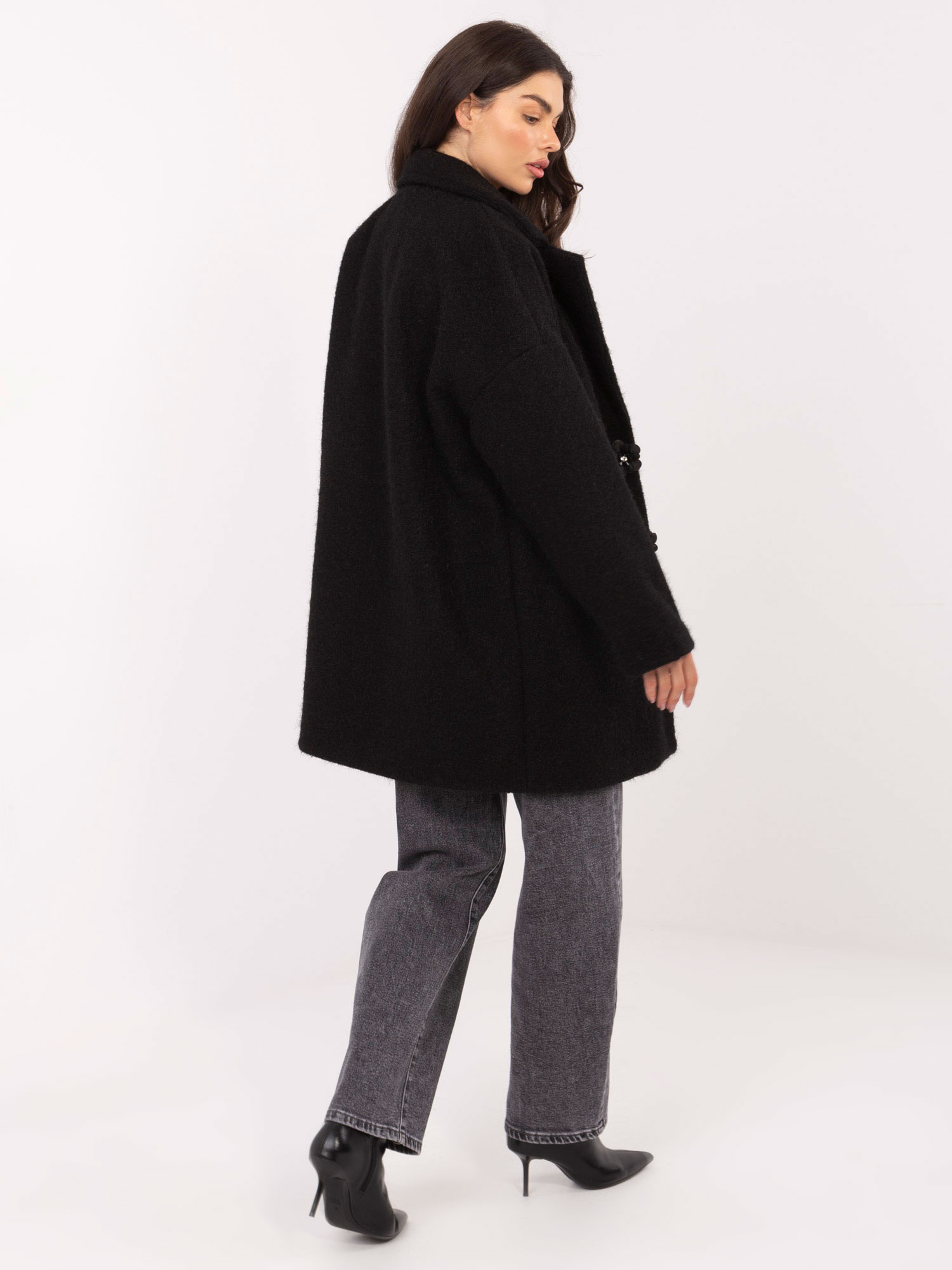 Czarny płaszcz z broszkami w kształcie kwiatów