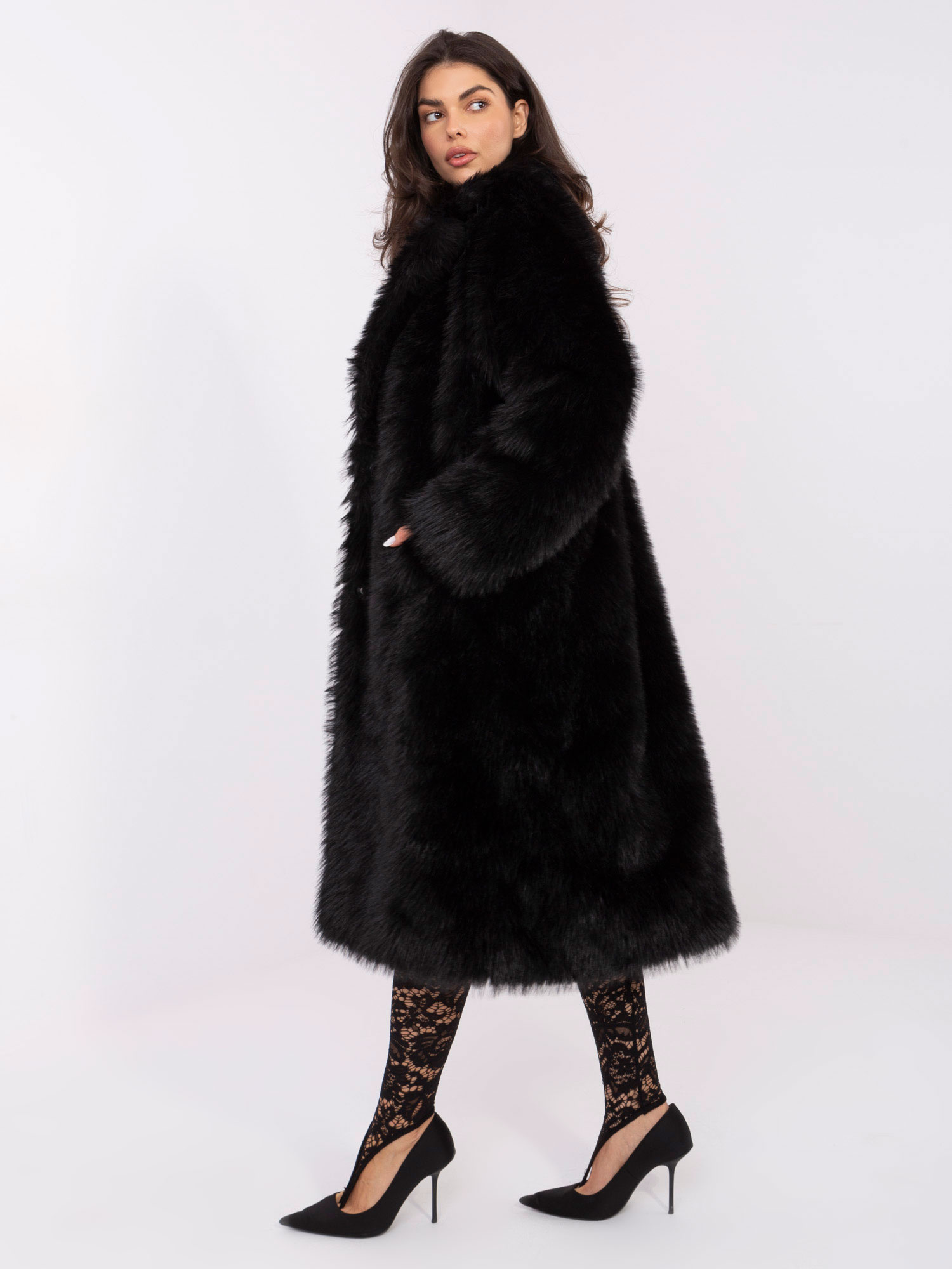 Czarny futrzany płaszcz z zapięciem na zatrzaski .