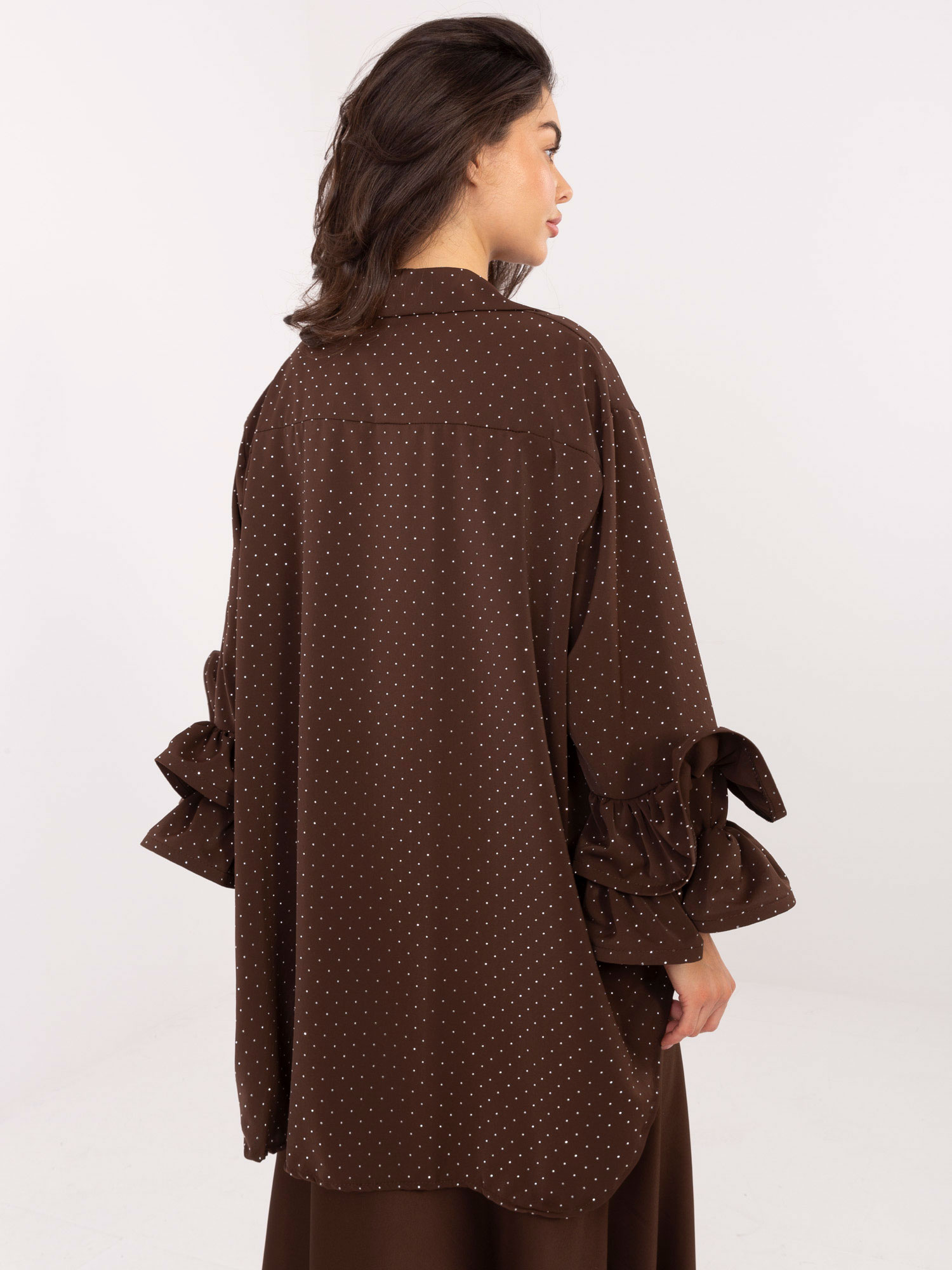 Wymiary koszuli w rozmiarze one size mierzone na płasko: szerokość pod pachami - 64 cm, długość całkowita - 75 cm (przód), długość całkowita - 84 cm (tył), szerokość w biodrach - 76 cm, długość rękawa - 48 cm (od szwu).