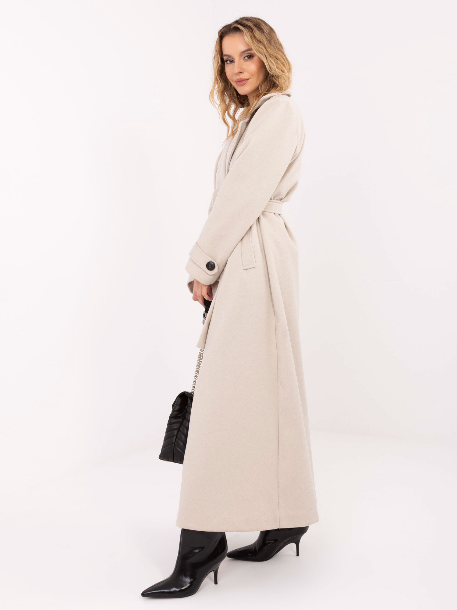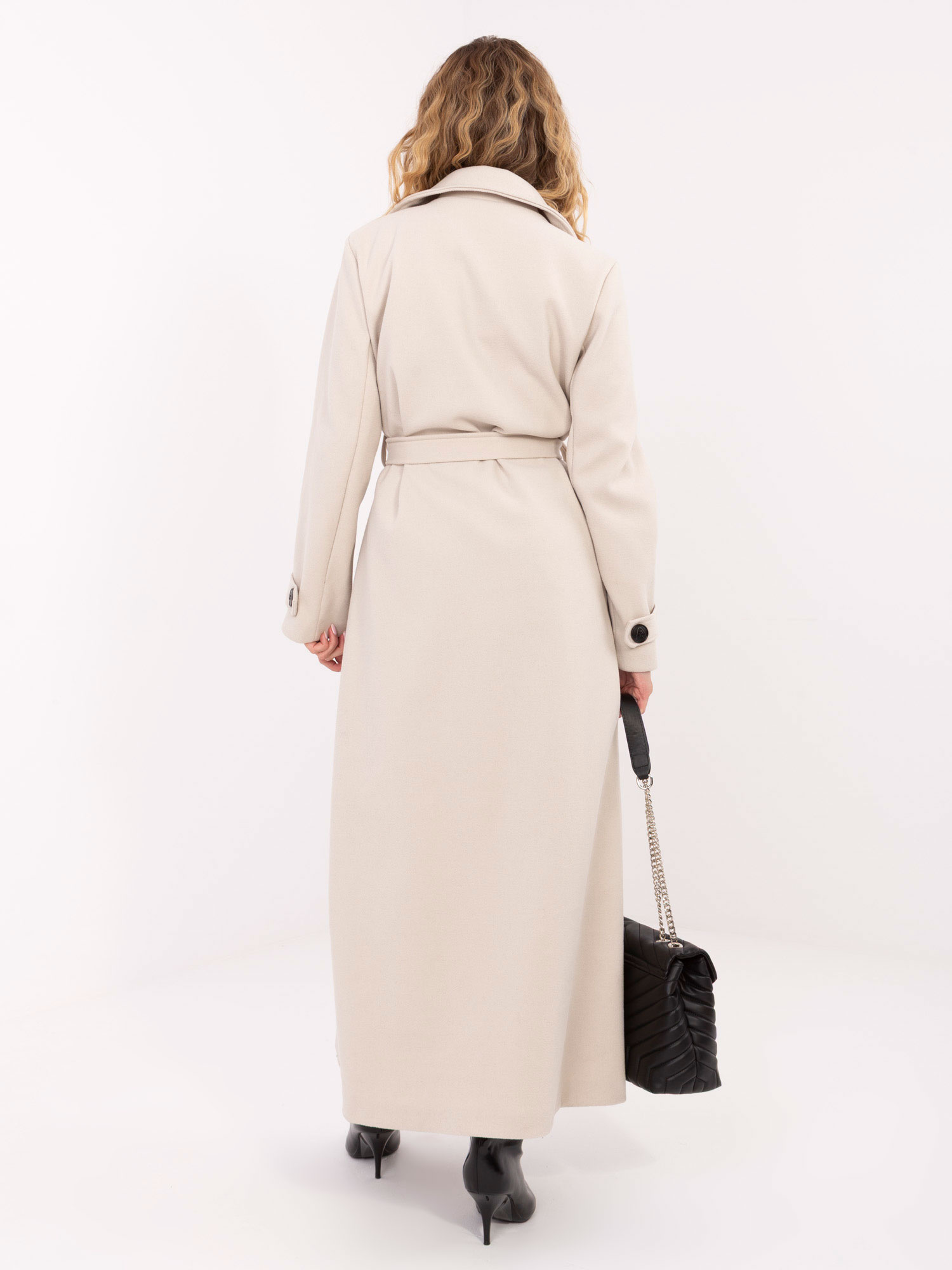 Jasnobeżowy długi płaszcz z wiązanym paskiem