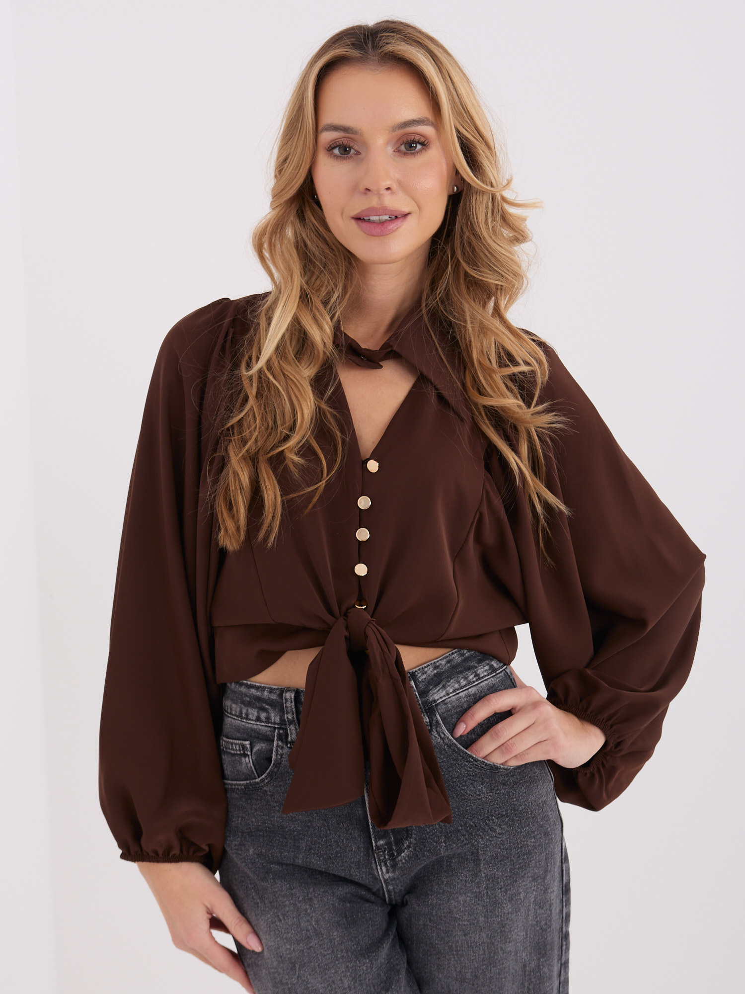 Brązowa krótka koszula z bufiastym rękawem