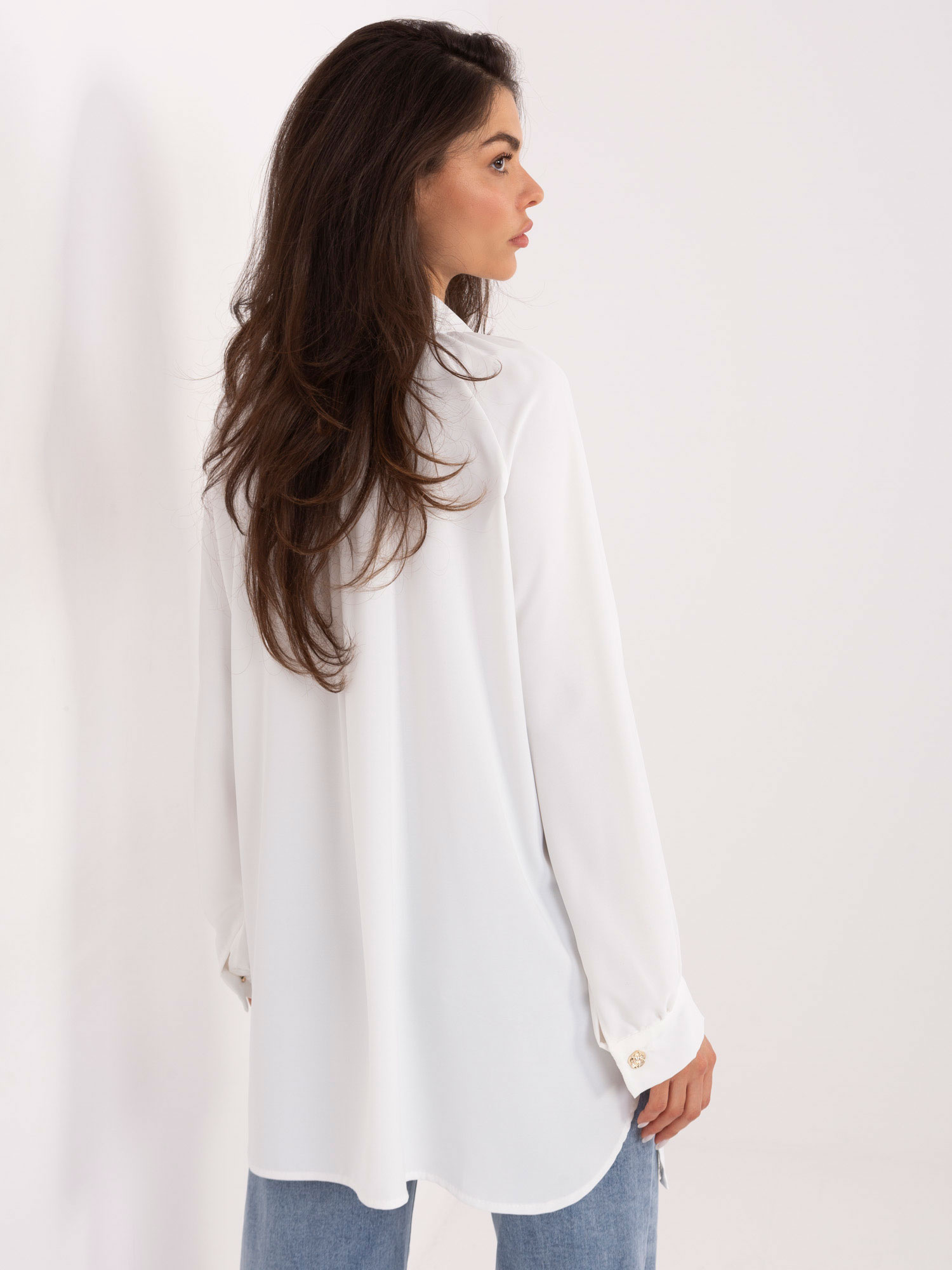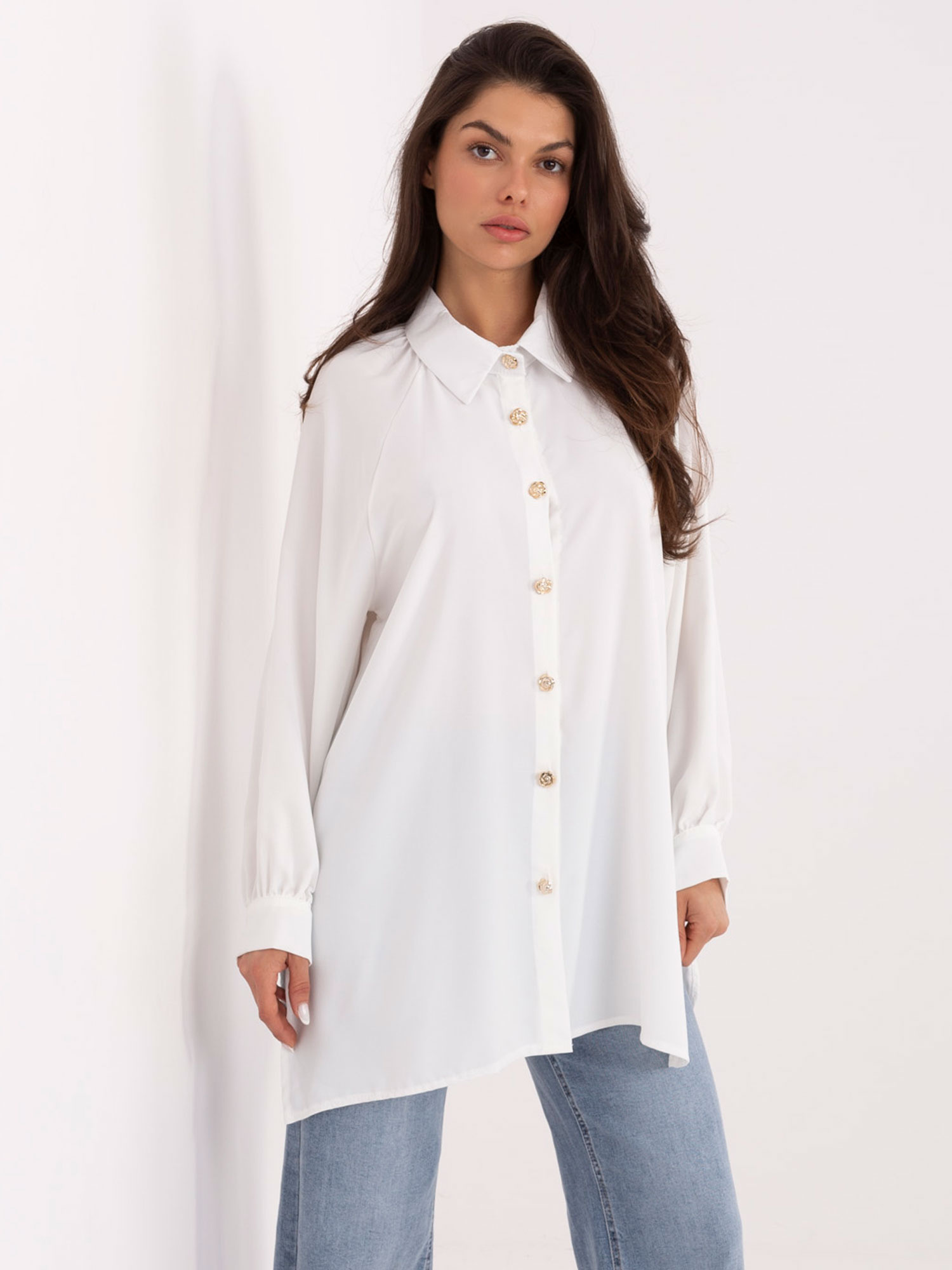 Biała długa koszula z ozdobnymi guzikami .