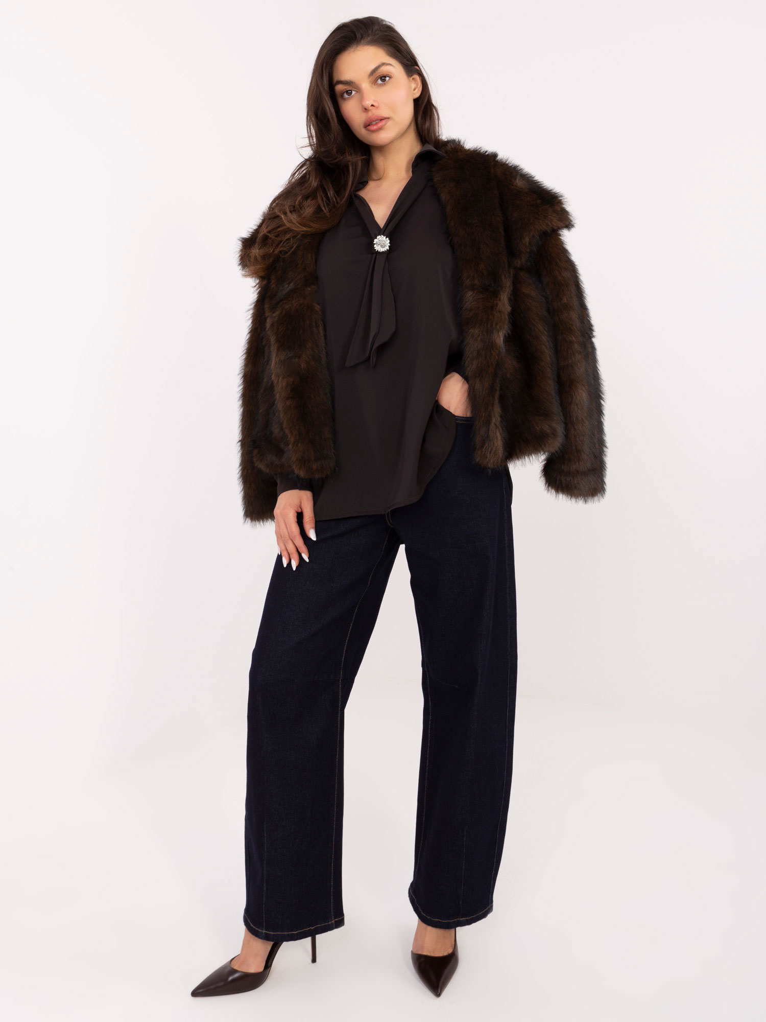 Czekoladowa wizytowa bluzka z bufiastym rękawem