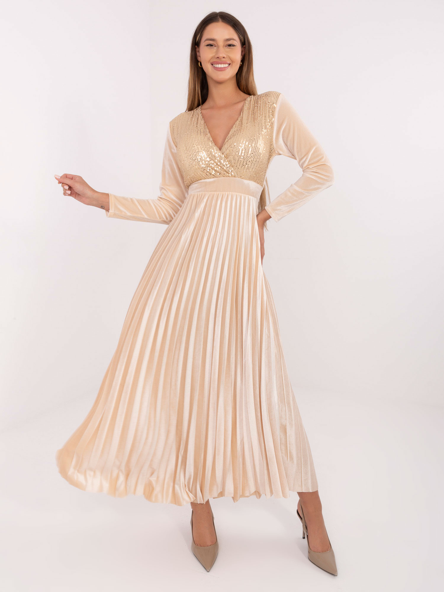 Wymiary sukienki w rozmiarze one size: szerokość pod pachami - 44 cm, szerokość w talii - 34 cm, długość rękawa - 58 cm, szerokość w biodrach - 70 cm, długość całkowita - 146 cm.