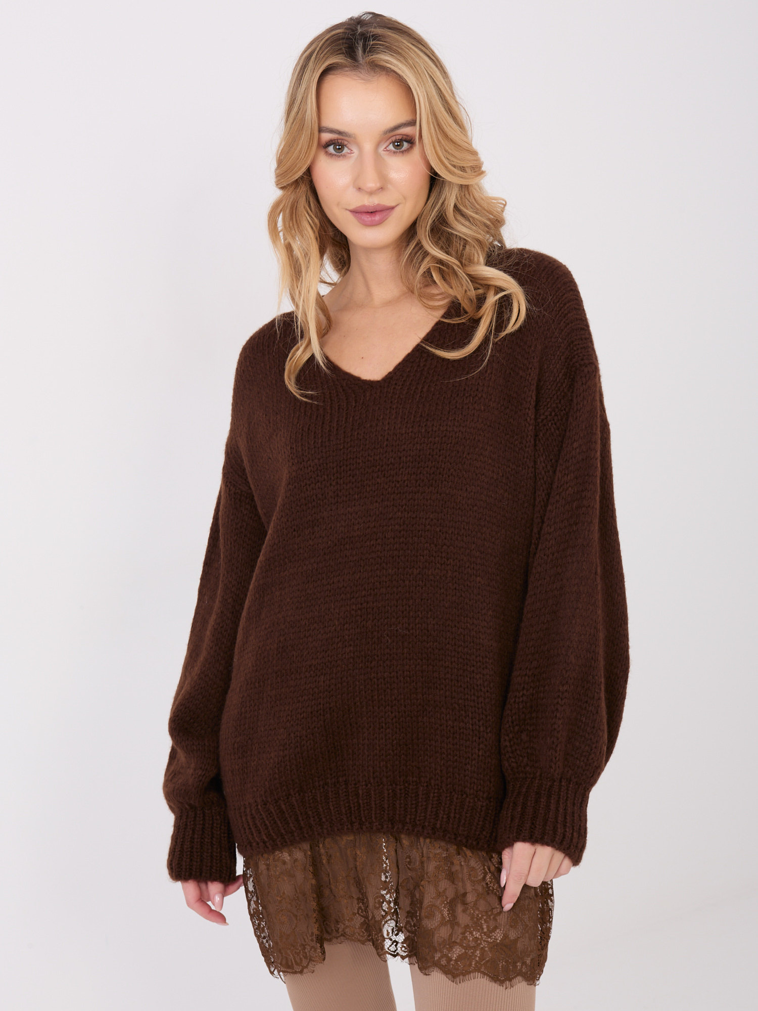 Wymiary swetra w rozmiarze one size: szerokość pod pachami - 61 cm, długość całkowita - 81 cm, długość rękawa - 54 cm (od szwu), szerokość w biodrach - 53 cm.