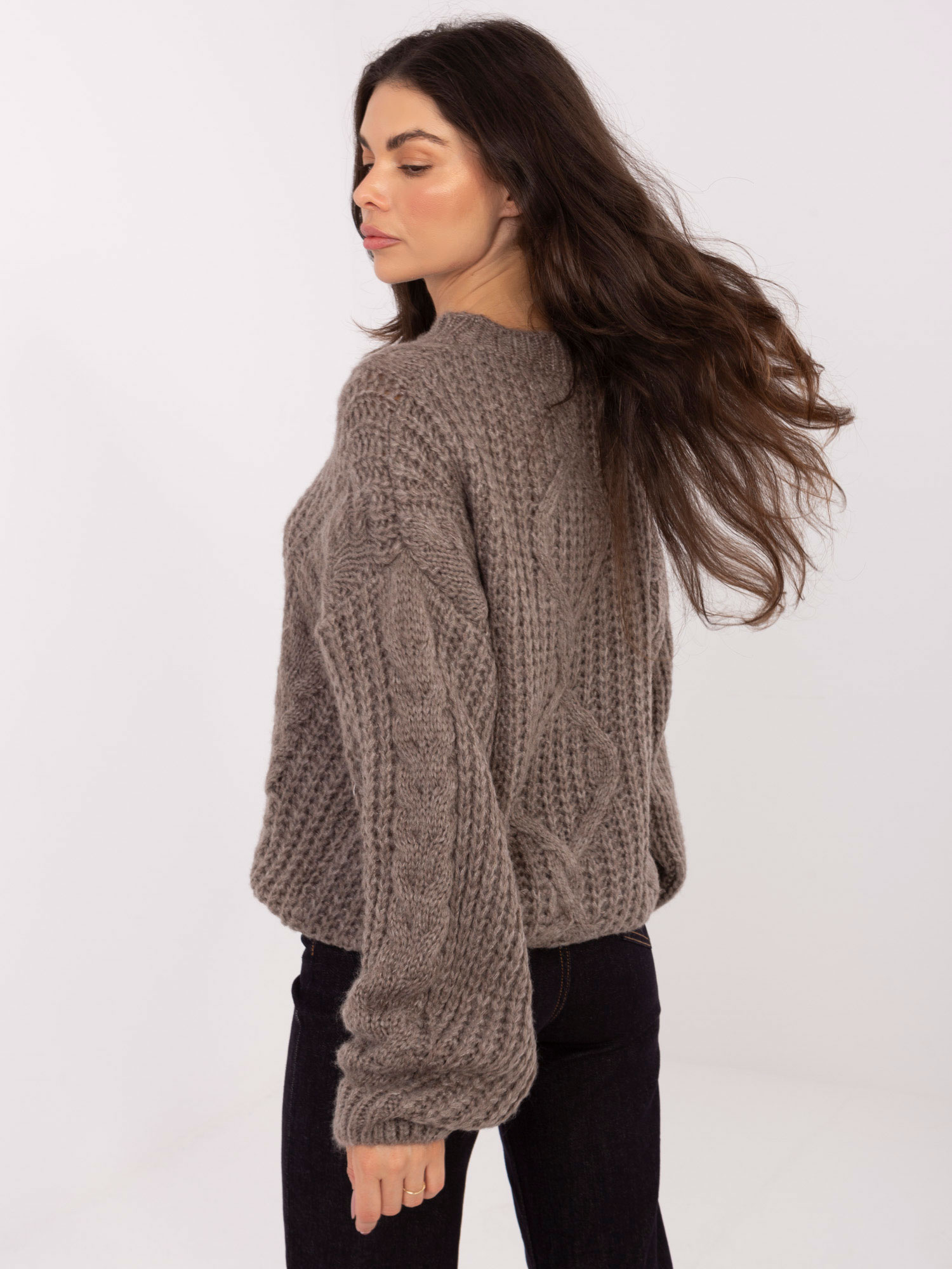 Wymiary swetra w rozmiarze one size: szerokość pod pachami - 64 cm, długość całkowita - 63 cm, długość rękawa - 57 cm (od szwu), szerokość w biodrach - 43 cm.