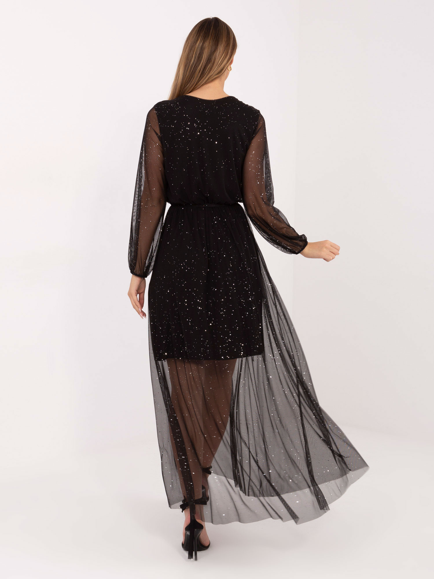 Wymiary sukienki w rozmiarze one size mierzone na płasko: szerokość pod pachami - 44 cm, długość całkowita - 147 cm, szerokość w biodrach - 60 cm, szerokość w talii - 28 cm, długość rękawa - 55 cm.