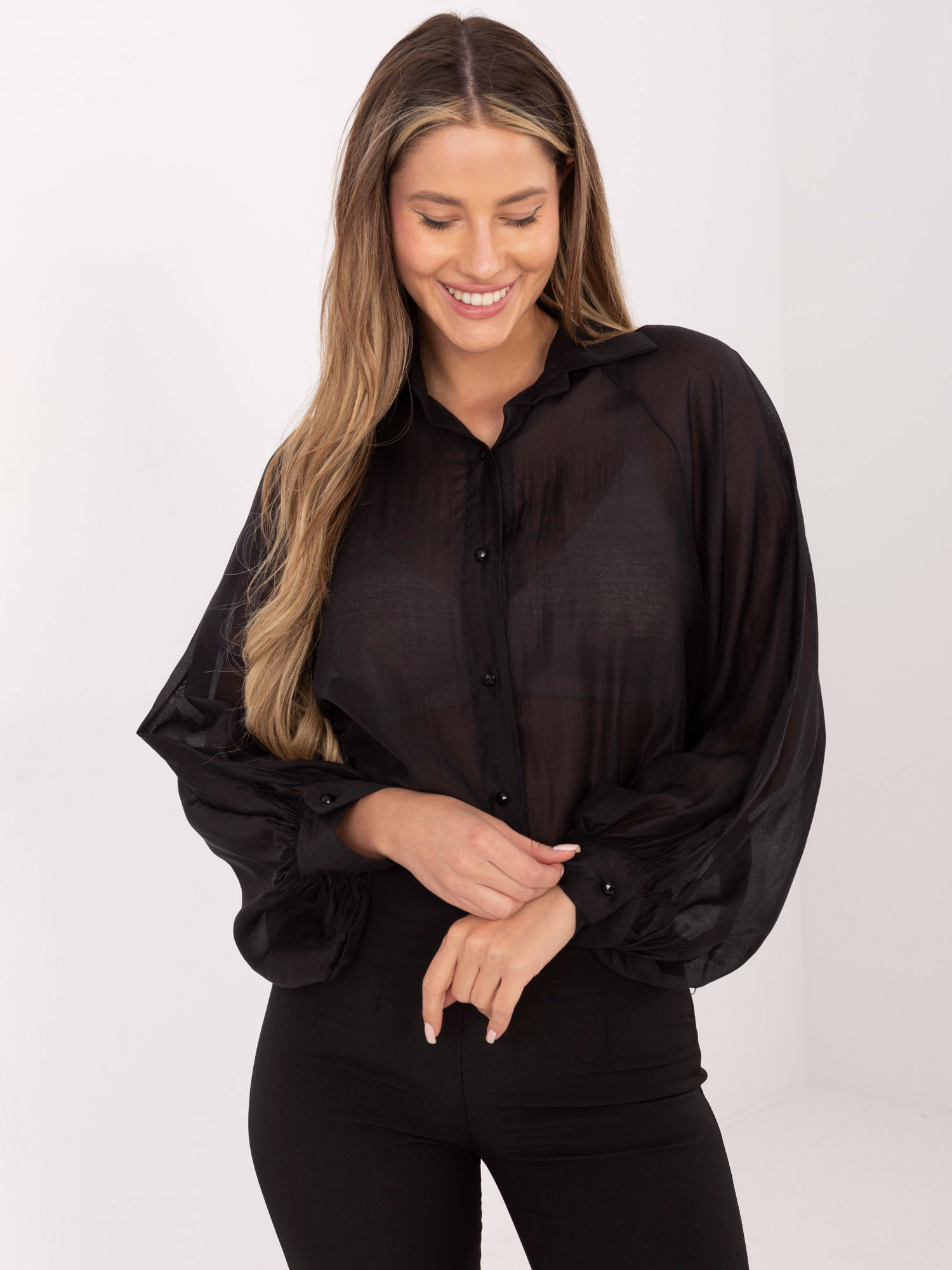 Czarna przezroczysta koszula z kołnierzykiem .