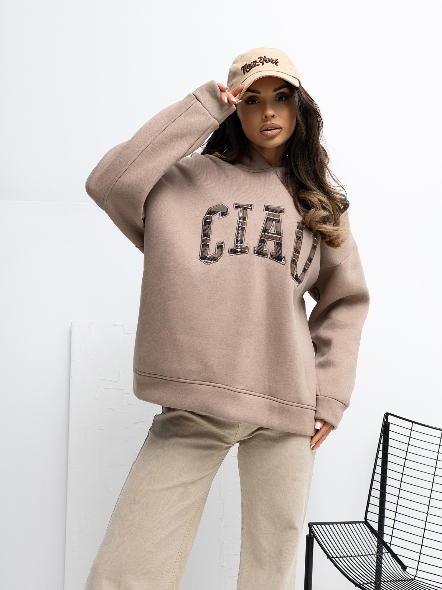 Ciemnobeżowa ocieplana bluza z kapturem RUE PARIS .