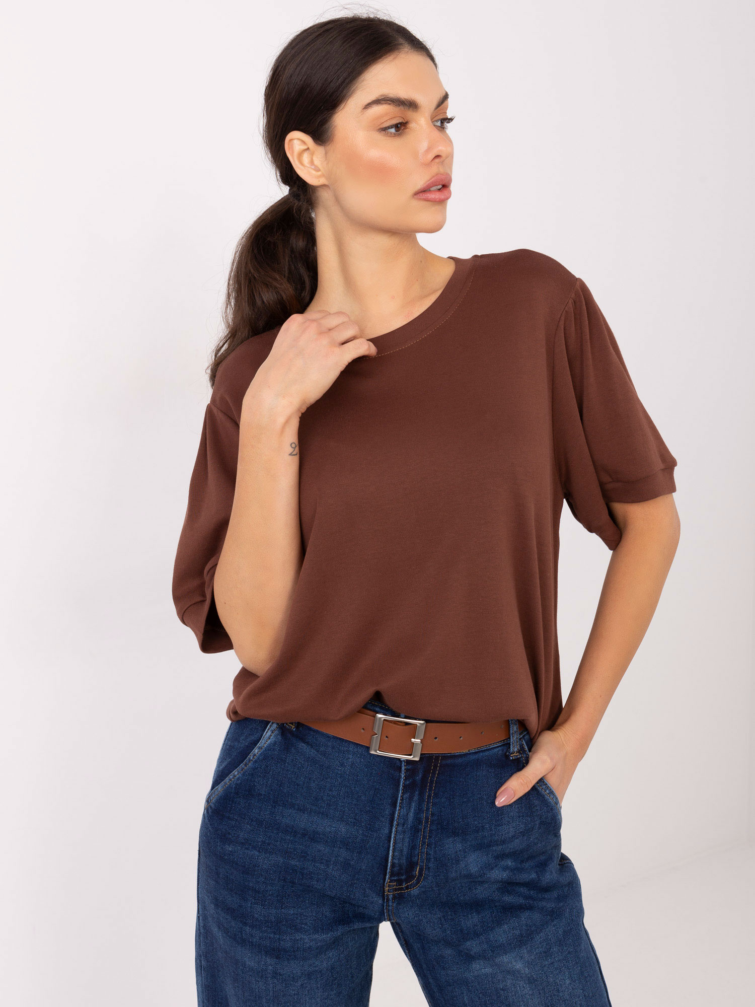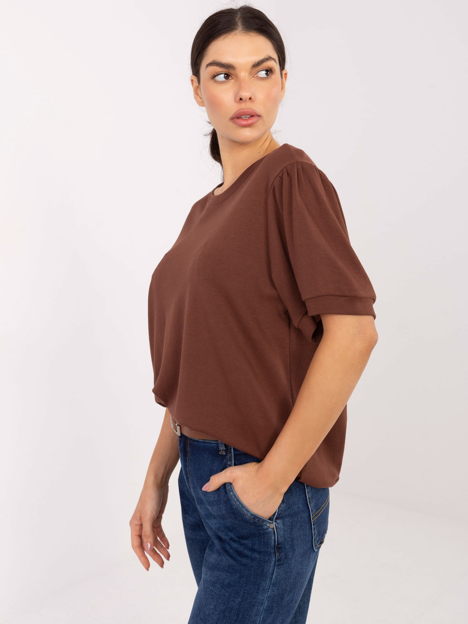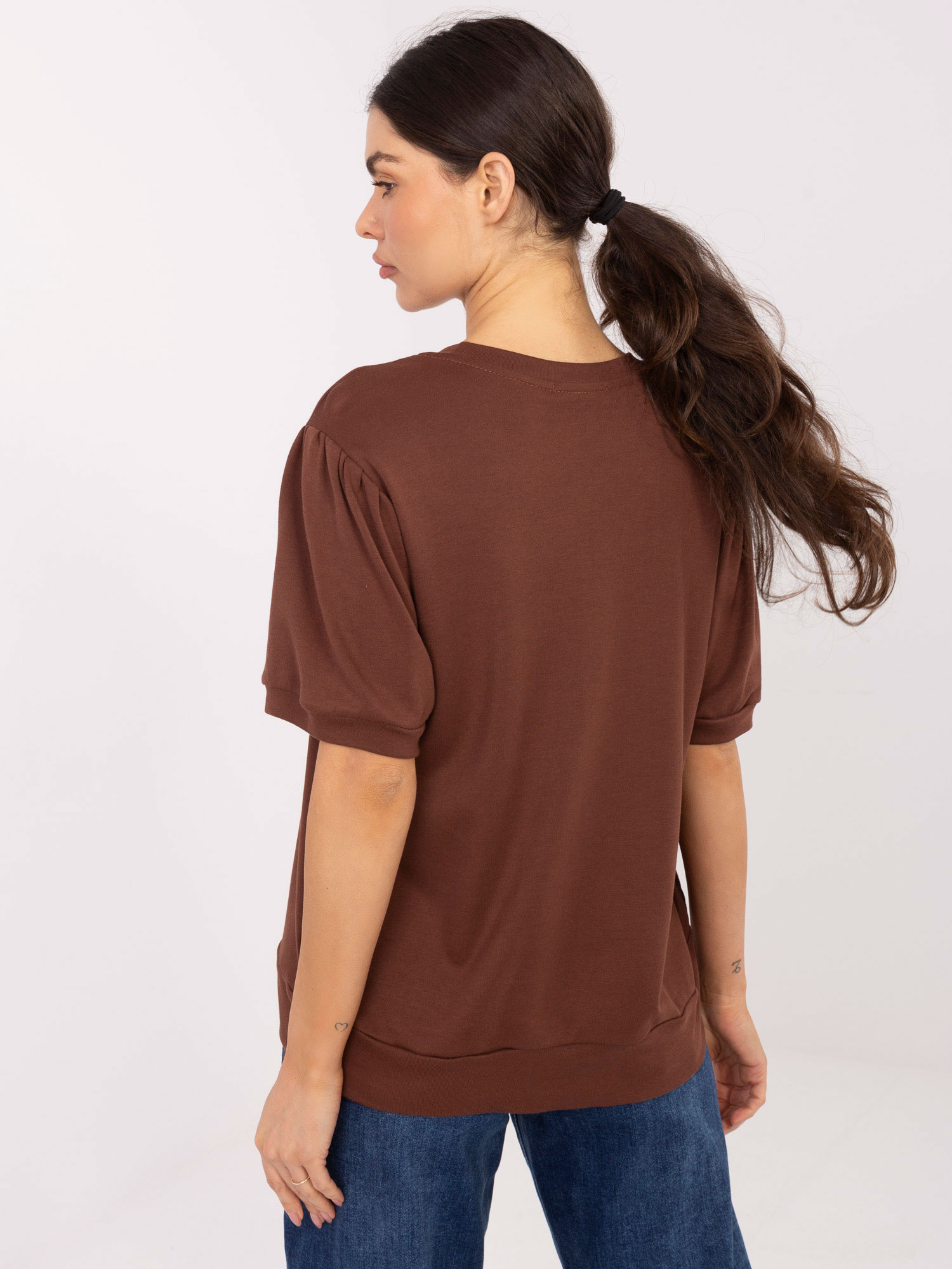 Wymiary bluzki w rozmiarze one size mierzone na płasko: szerokość pod pachami - 55 cm, długość całkowita - 62 cm, długość rękawa - 25 cm (od szwu), szerokość w biodrach - 52 cm.