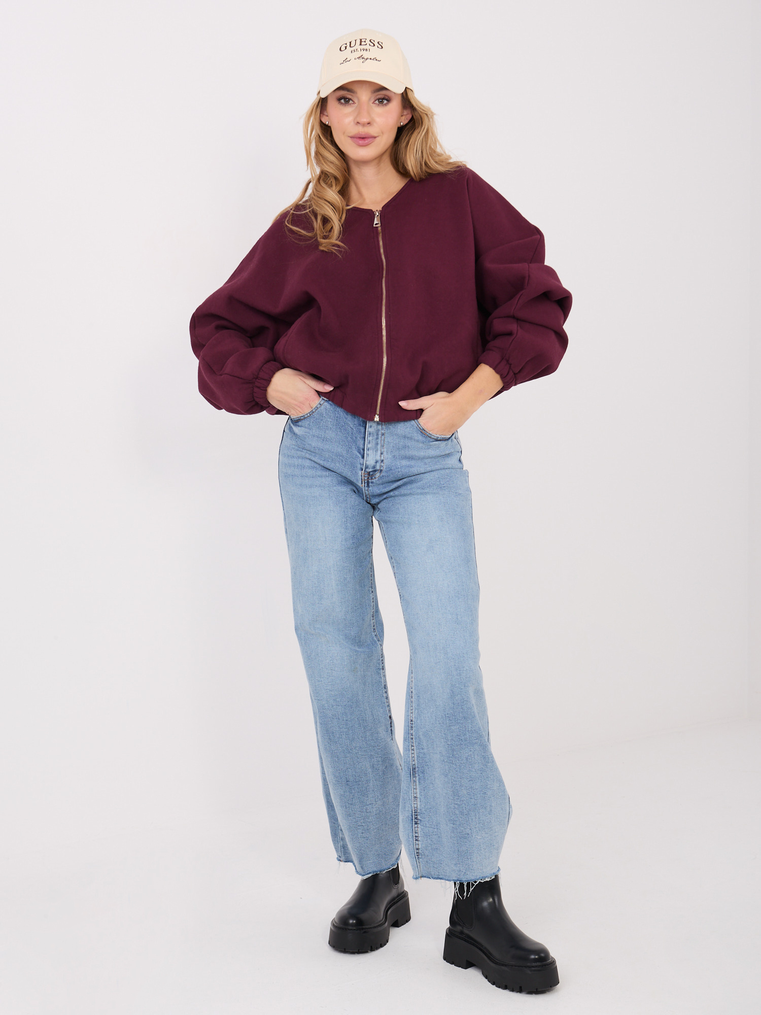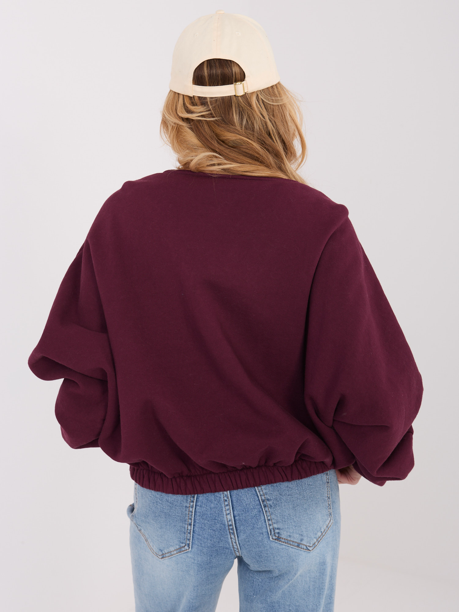 Burgundowa rozpinana bluza z dekoltem V .