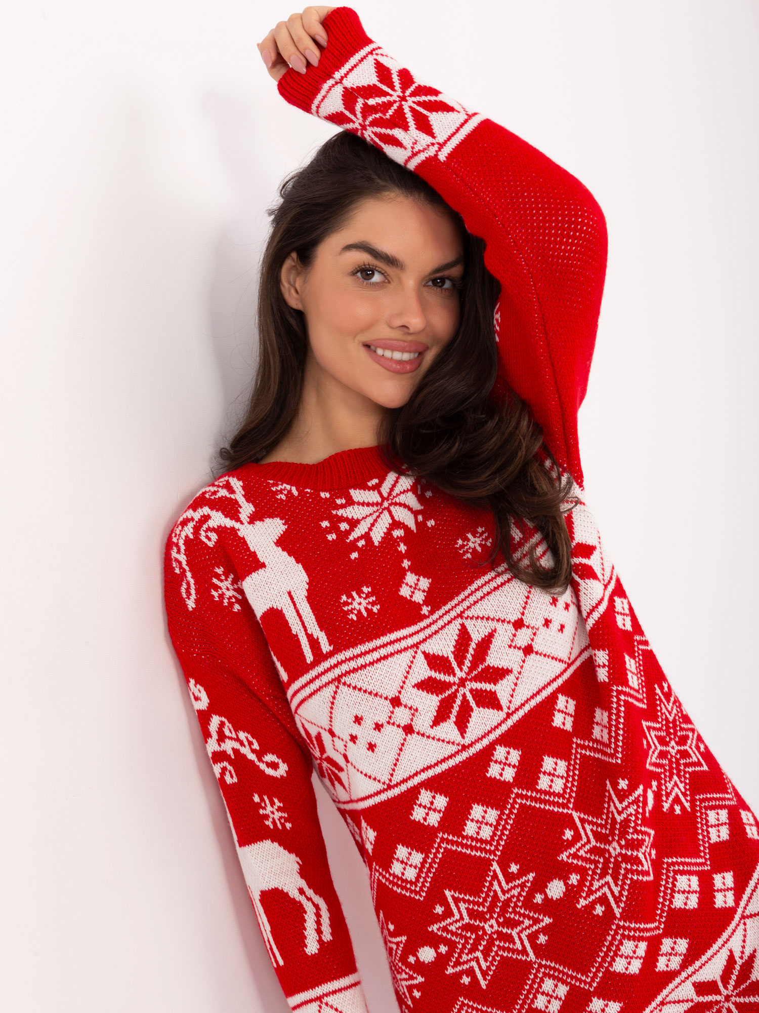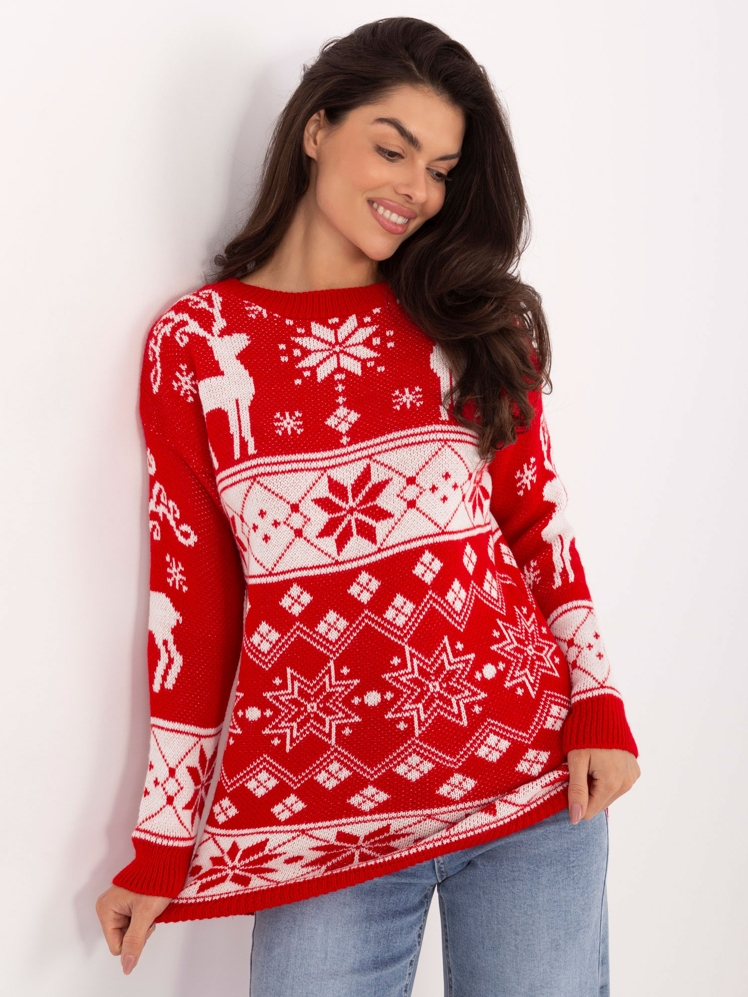 Czerwony długi sweter w renifery