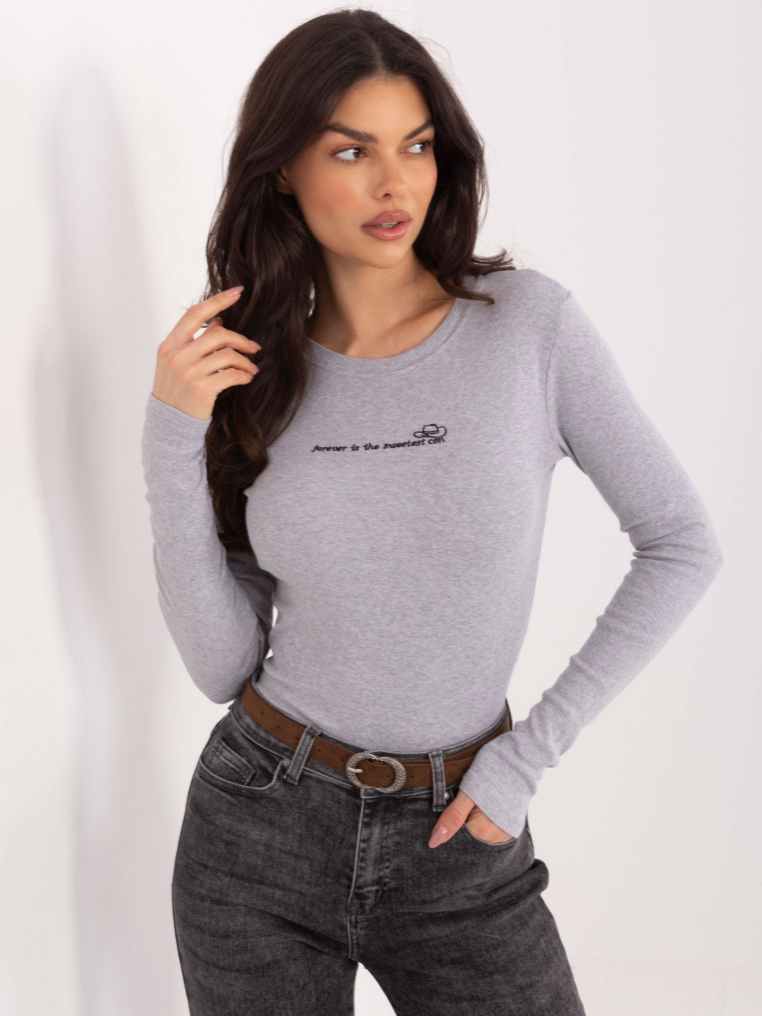 Jasnoszara bluzka z haftowanym napisem