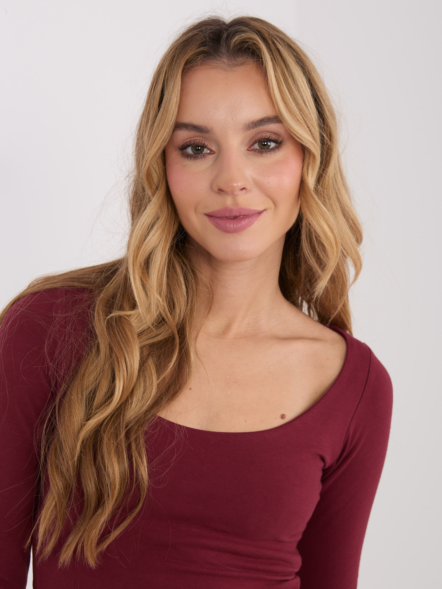 Bordowa krótka bluzka basic z długim rękawem