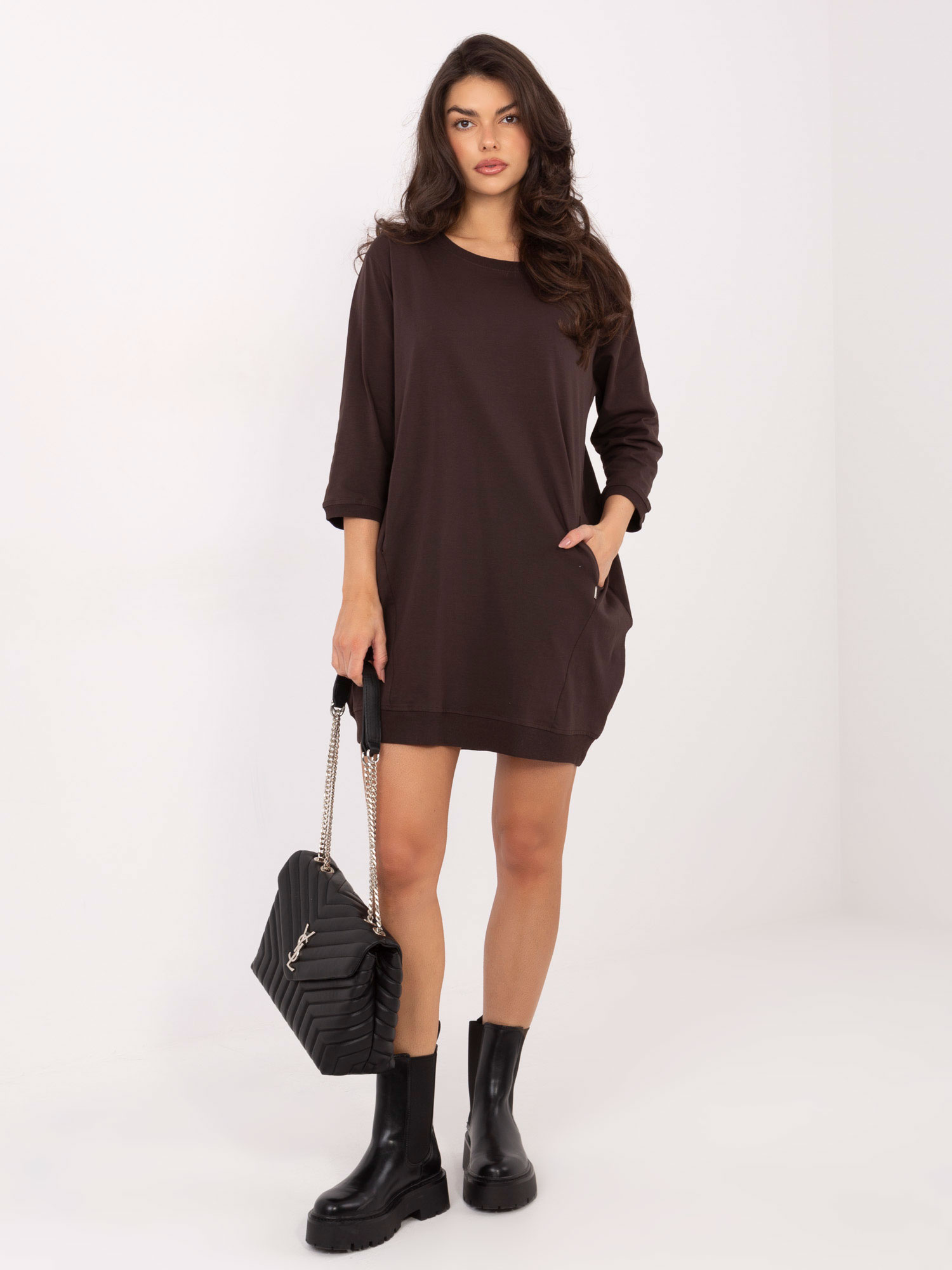 Wymiary sukienki w rozmiarze S/M mierzone na płasko: szerokość pod pachami - 57 cm, szerokość w biodrach - 60 cm, długość rękawa - 43 cm (od szwu), długość całkowita - 86 cm.