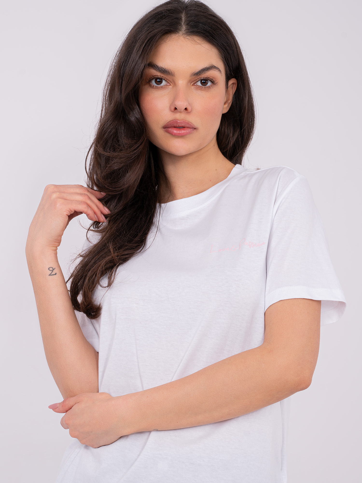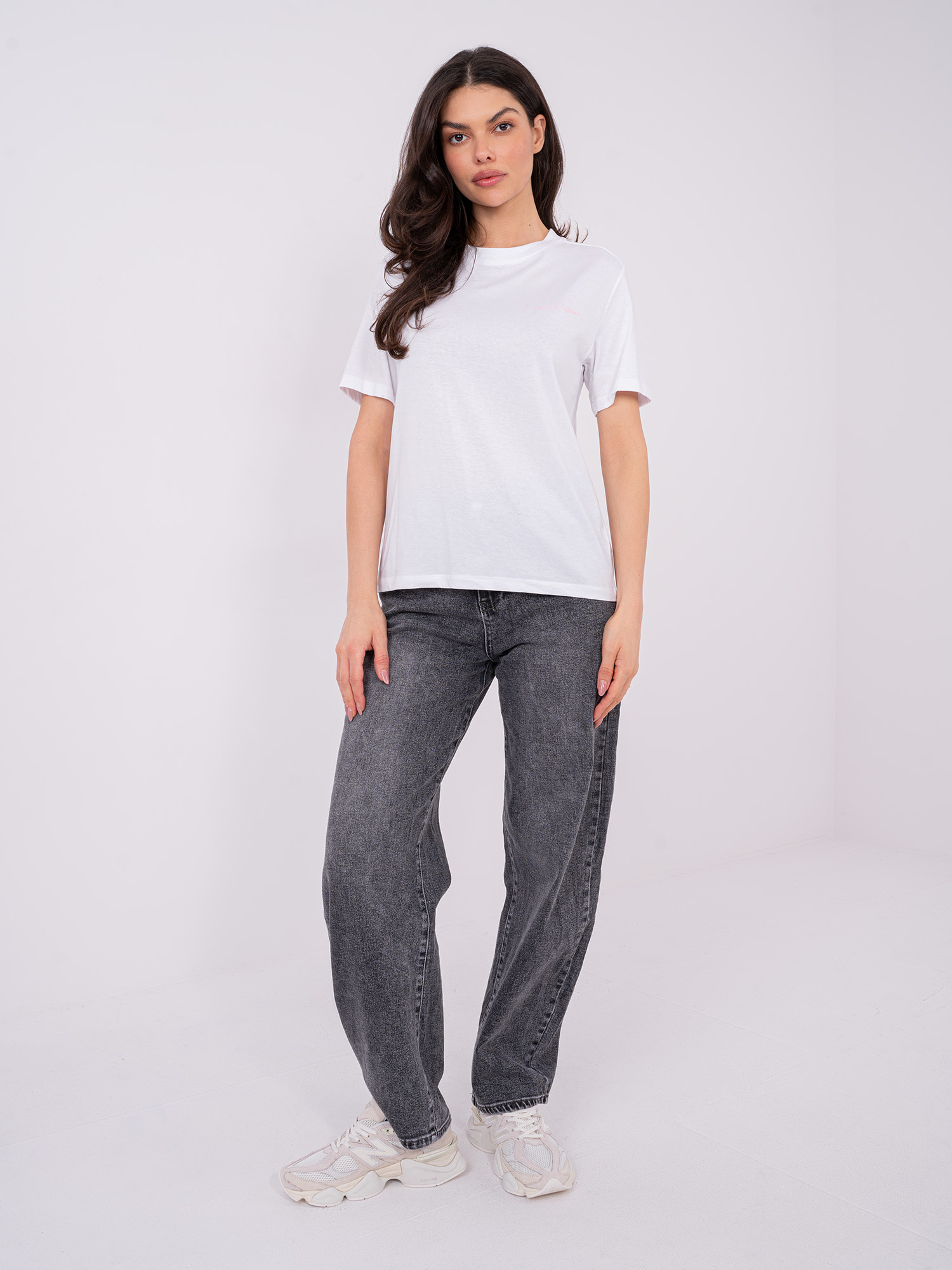 Wymiary t-shirtu w rozmiarze S mierzone na płasko: szerokość pod pachami - 49 cm, długość całkowita - 61 cm, szerokość w biodrach - 49 cm, długość rękawa - 21 cm (od szwu).