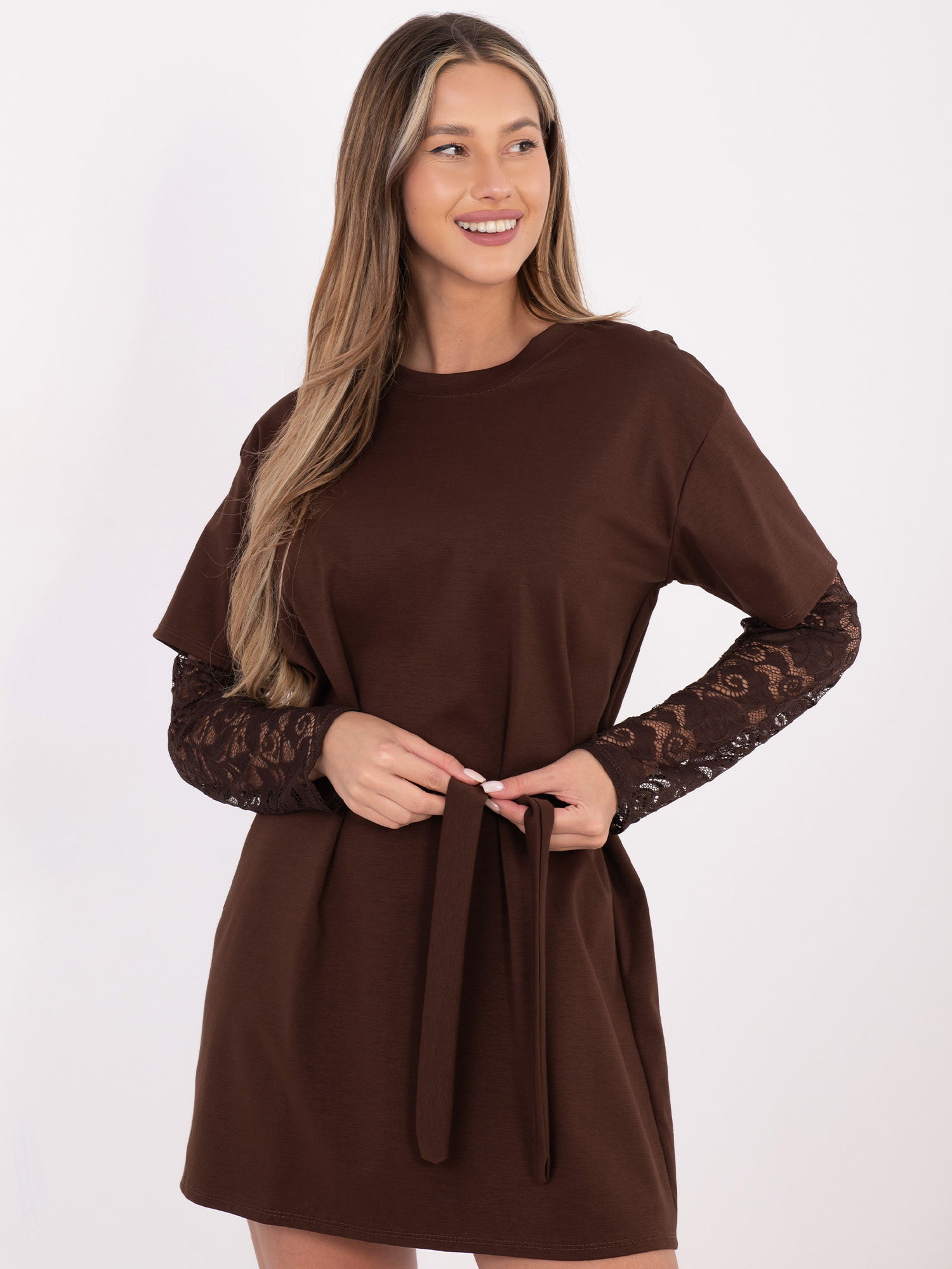 Brązowa krótka sukienka z wiązanym paskiem ..
