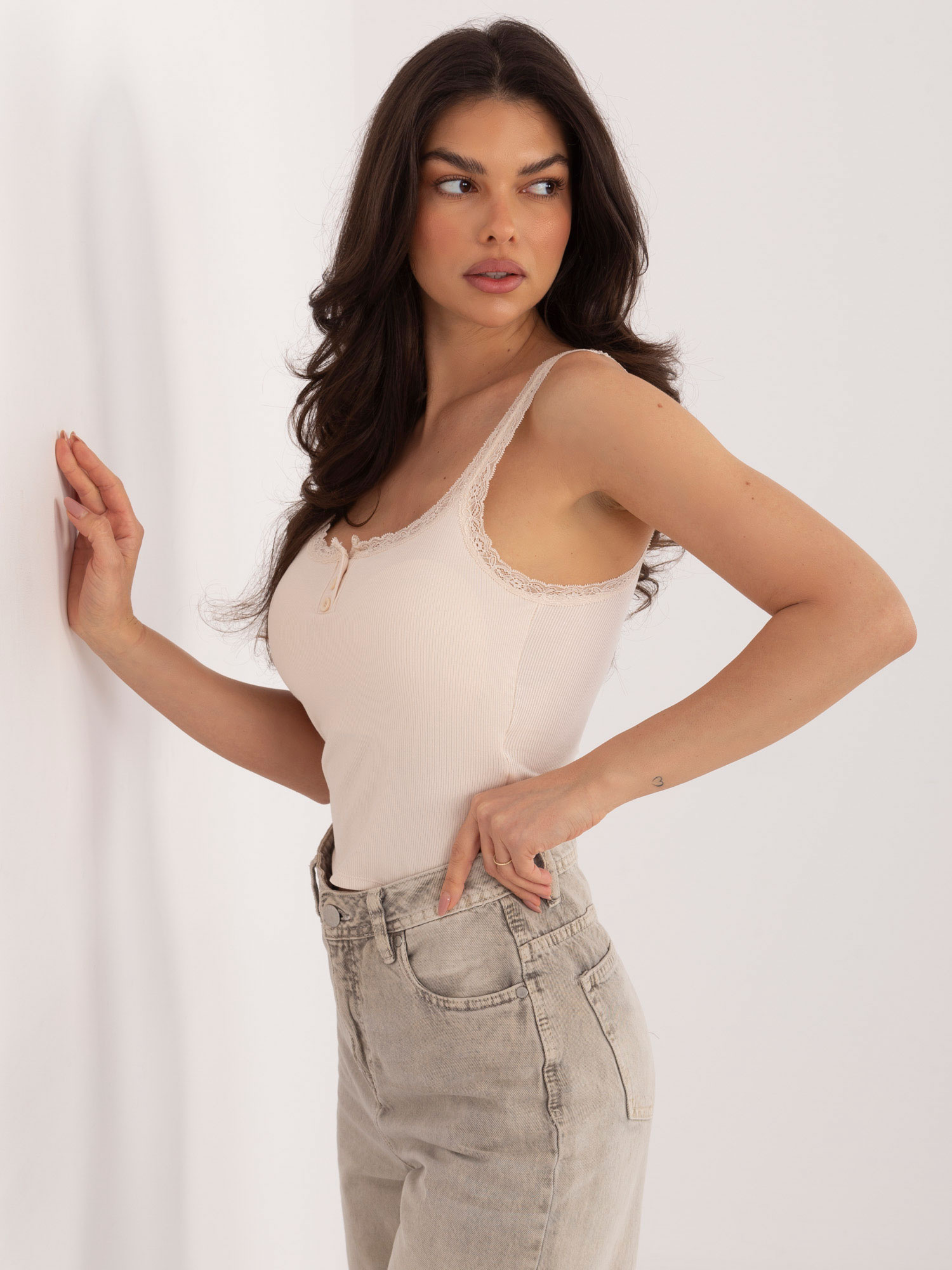 Jasnobeżowy krótki top z koronką