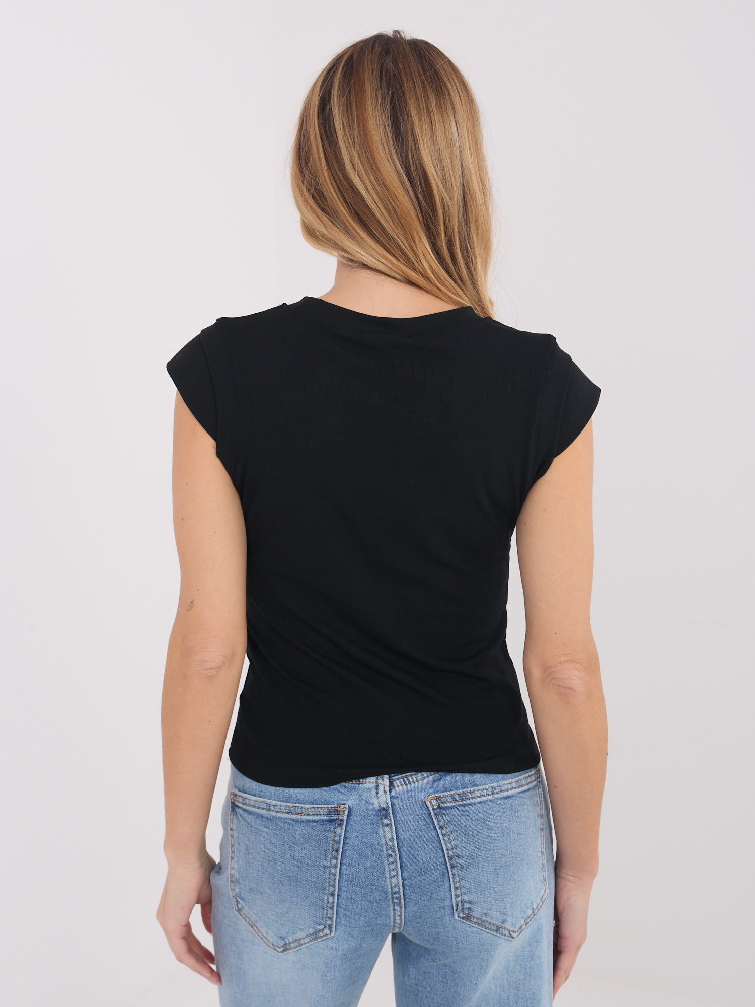 Wymiary topu w rozmiarze one size mierzone na płasko: szerokość pod pachami - 42 cm, szerokość w biodrach - 38 cm, długość rękawa - 14 cm (od szwu), długość całkowita - 52 cm.