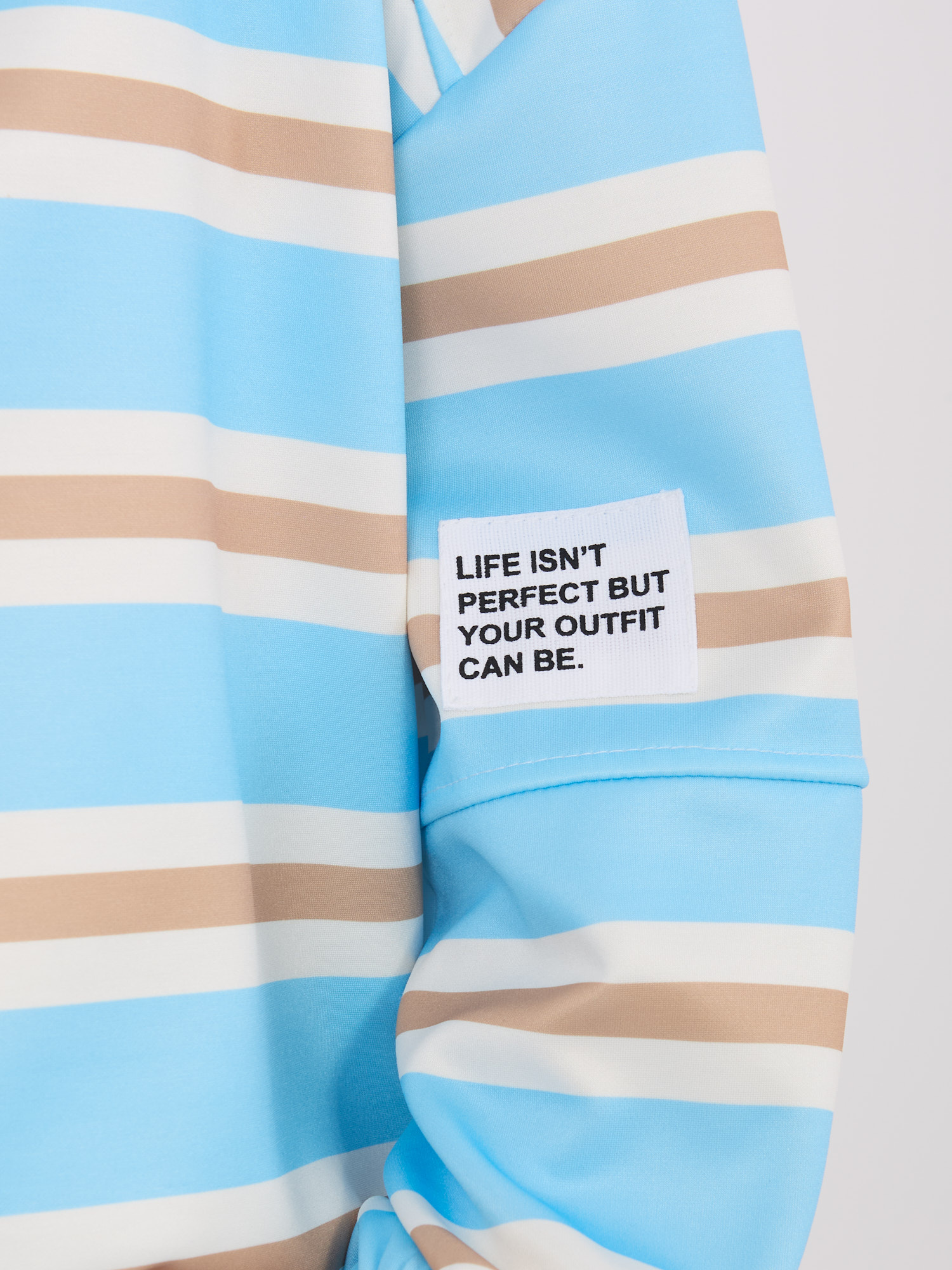 Wymiary bluzy w rozmiarze one size mierzone na płasko: szerokość pod pachami - 64 cm, długość rękawa - 46 cm (od szwu), szerokość w biodrach - 59 cm, długość całkowita - 56 cm (przód), długość całkowita - 61 cm (tył).