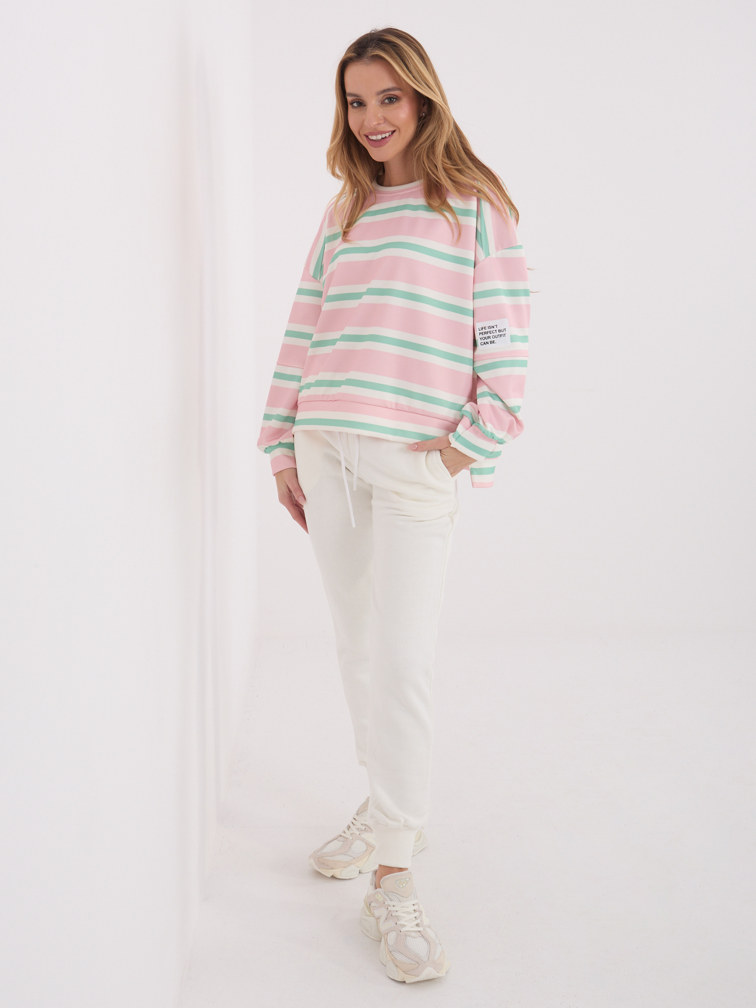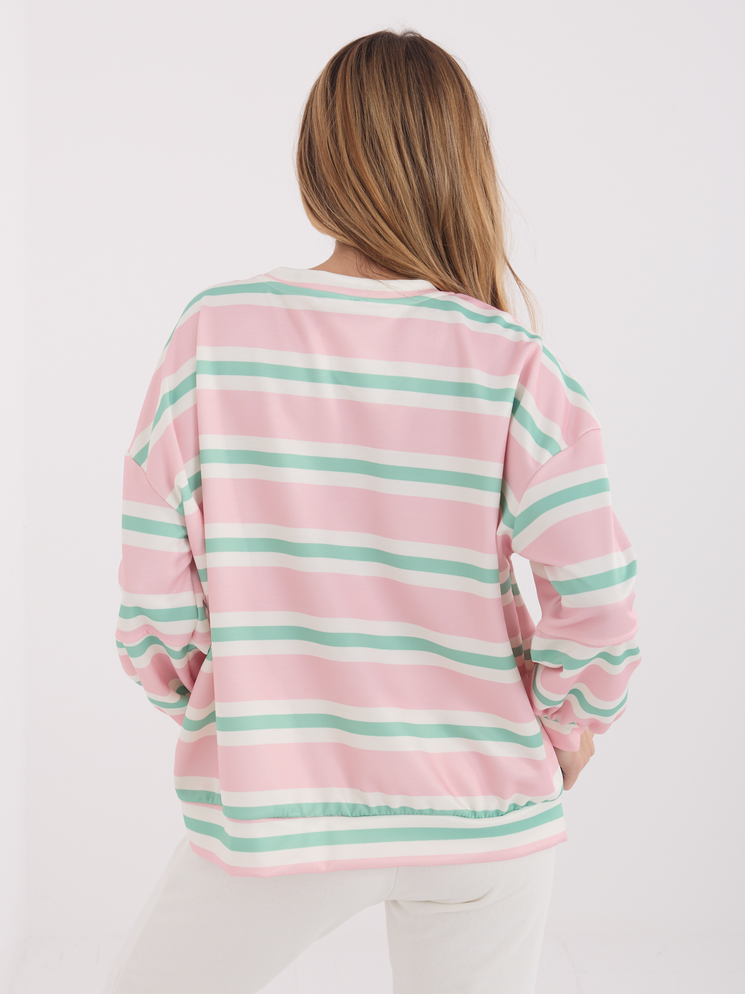 Wymiary bluzy w rozmiarze one size mierzone na płasko: szerokość pod pachami - 64 cm, długość rękawa - 46 cm (od szwu), szerokość w biodrach - 59 cm, długość całkowita - 56 cm (przód), długość całkowita - 61 cm (tył).