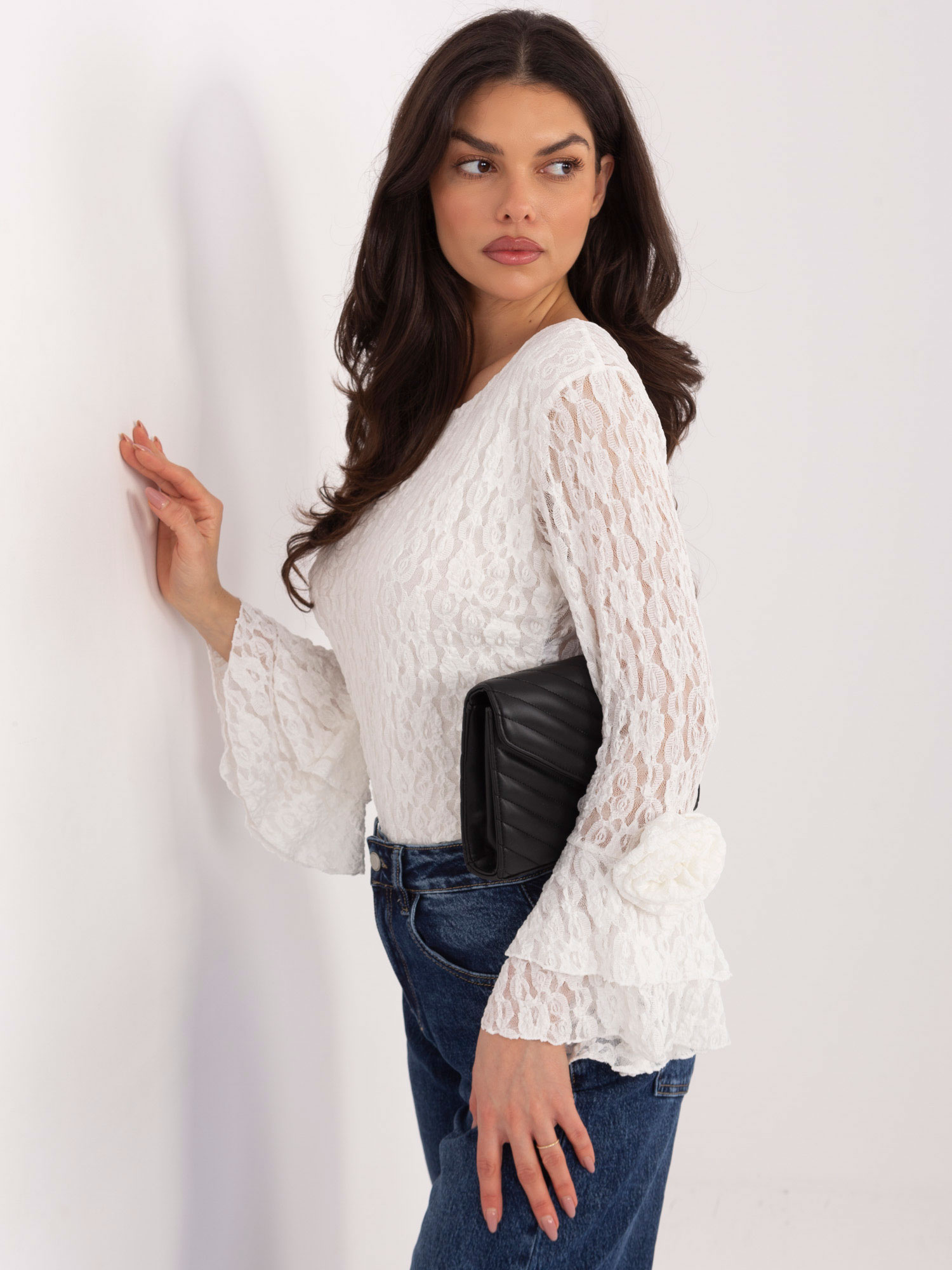 Ecru koronkowa bluzka z rozkloszowanymi rękawami .