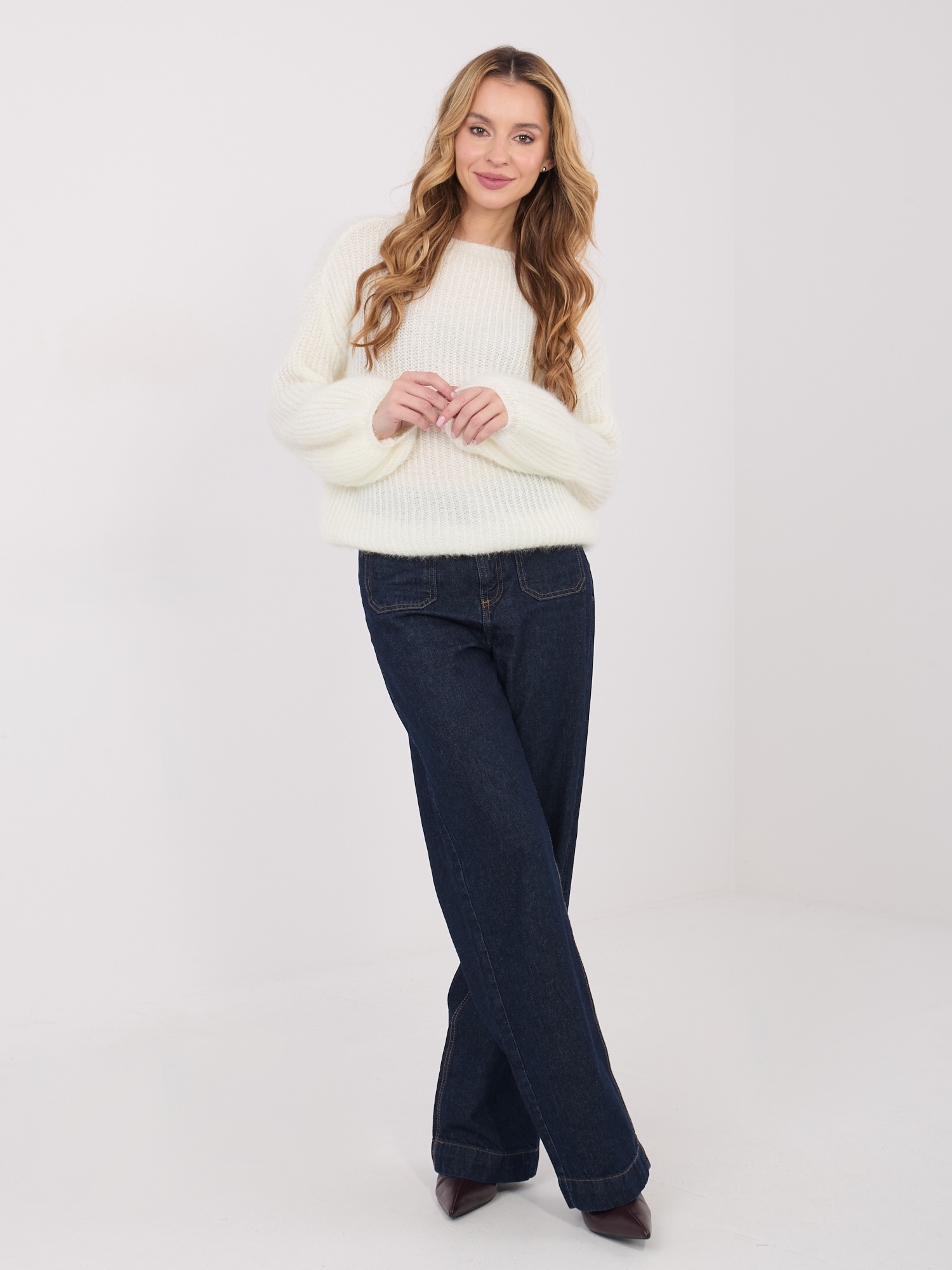 Ecru damski sweter z bufiastymi rękawami