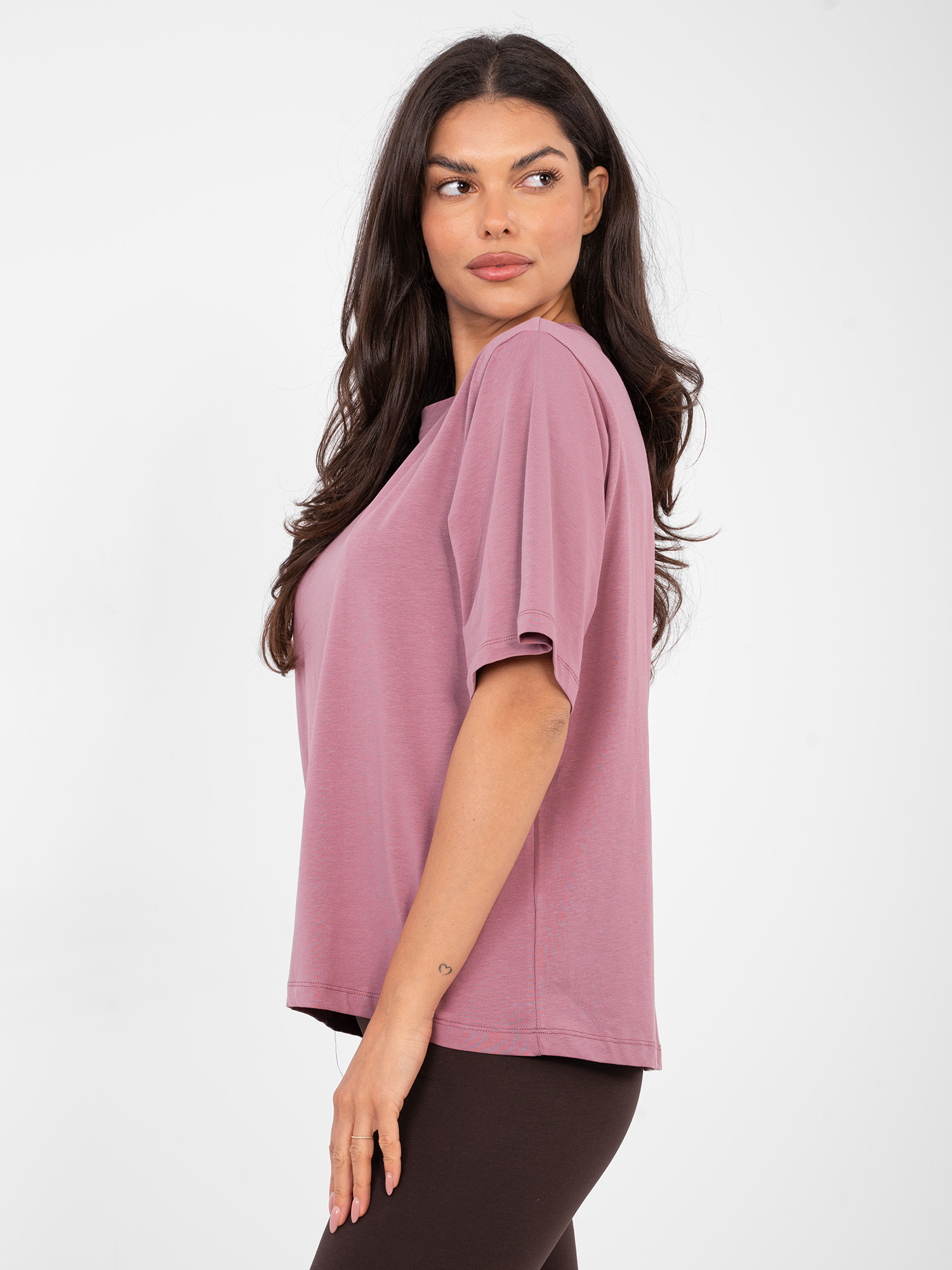 Brudnoróżowy t-shirt z dłuższym tyłem RUE PARIS .