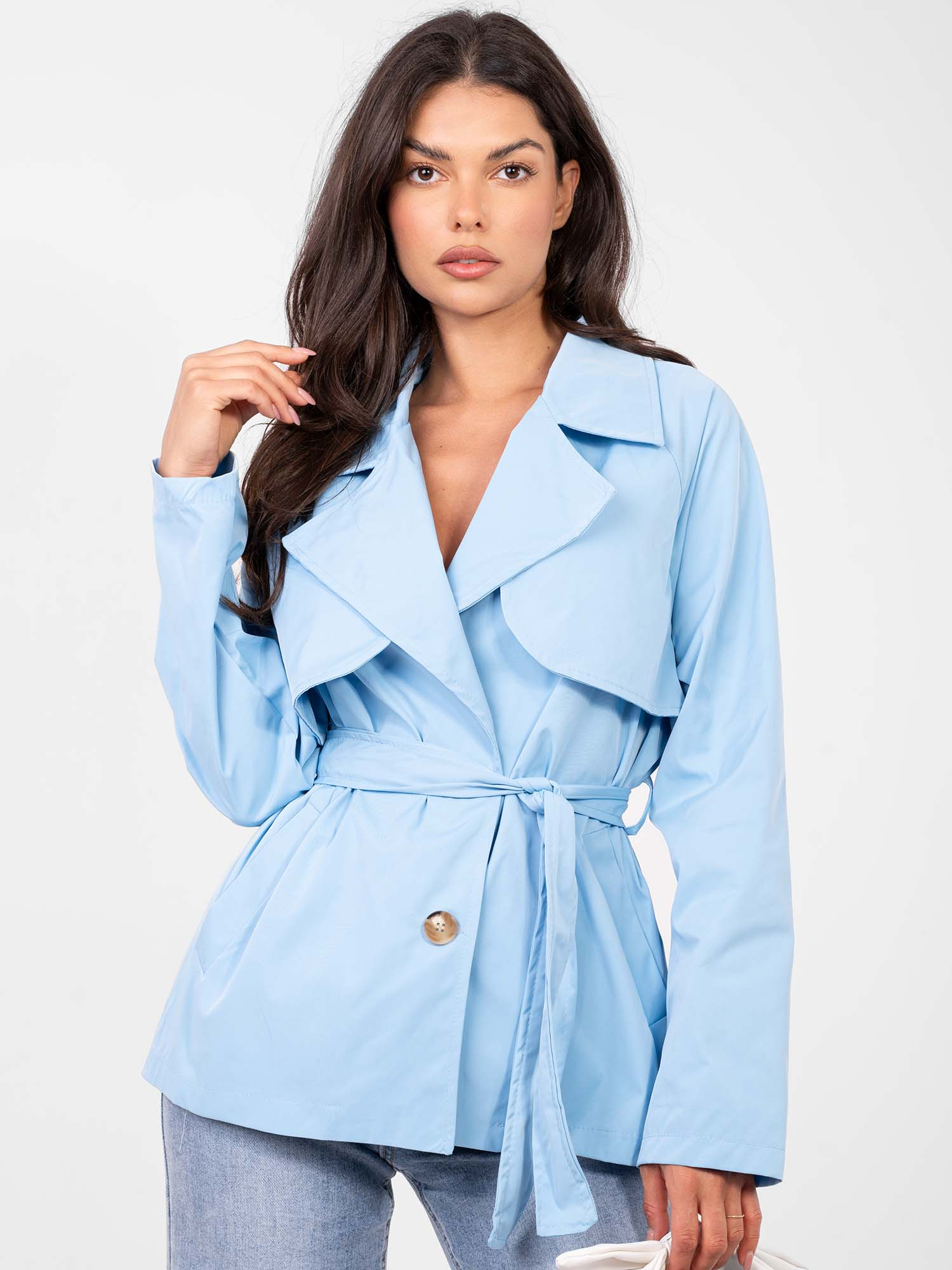 Jasnoniebieski przejściowy płaszcz z paskiem RUE PARIS .