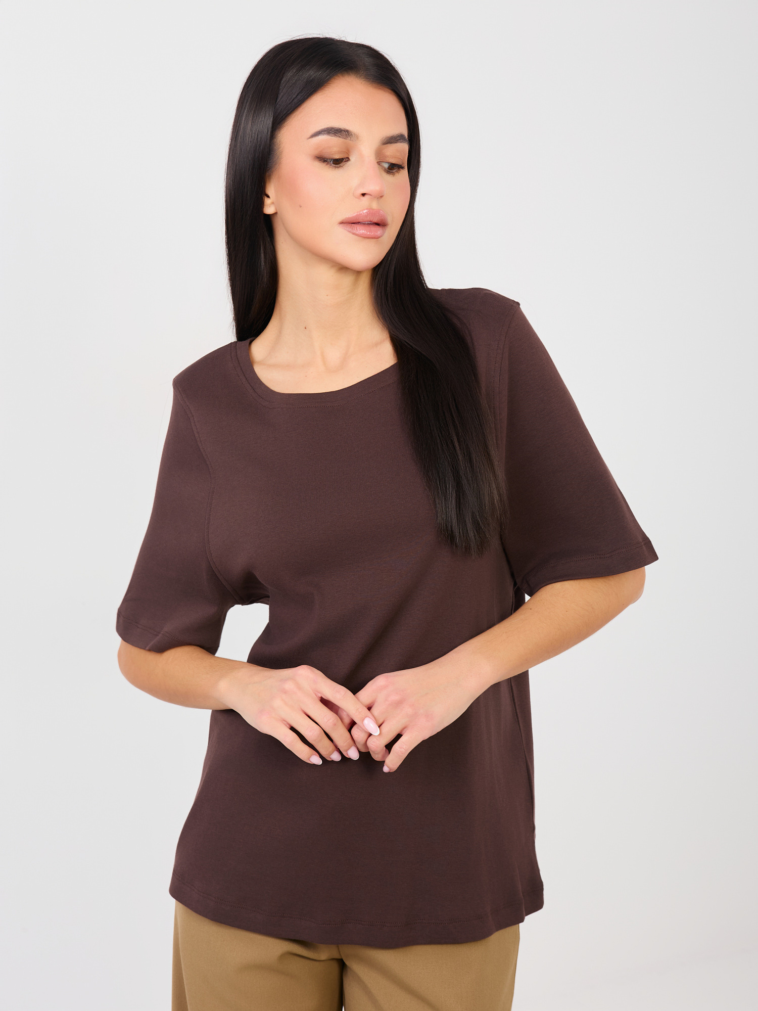 Czekoladowy t-shirt basic z okrągłym dekoltem RUE PARIS .
