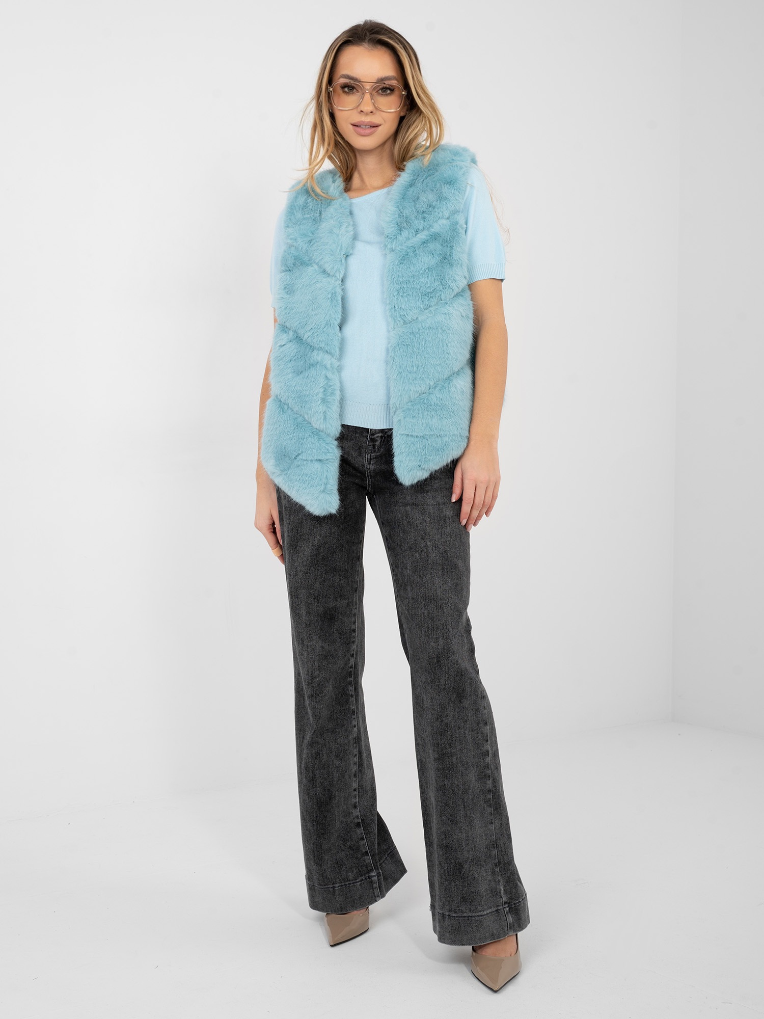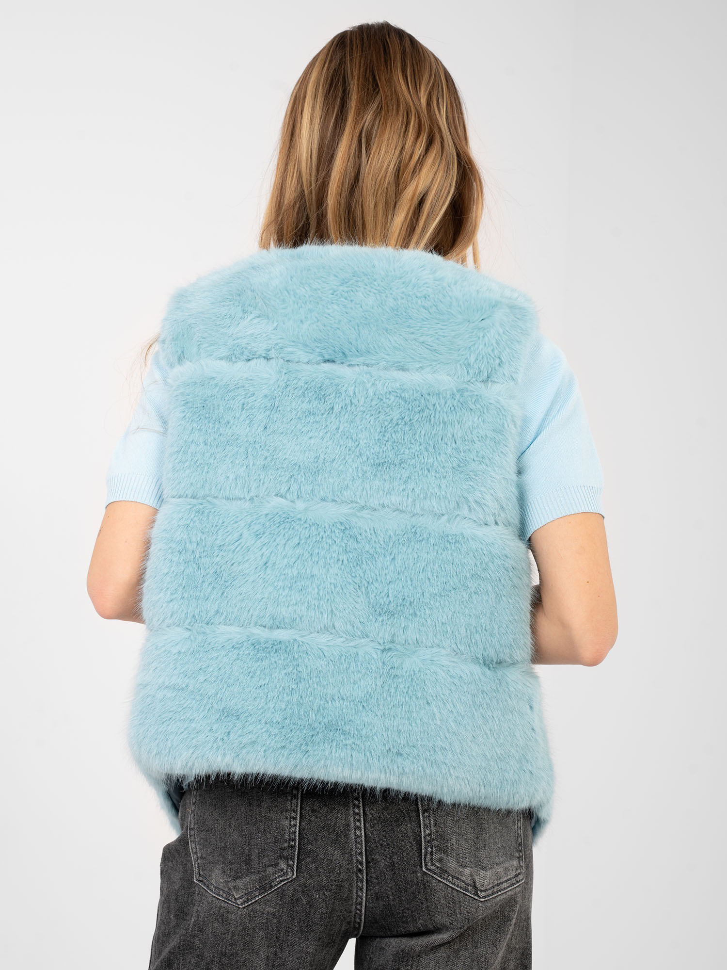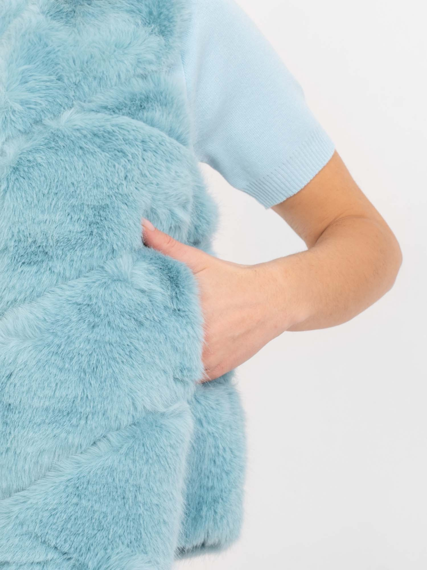 Miętowa futrzana kamizelka z kieszeniami .