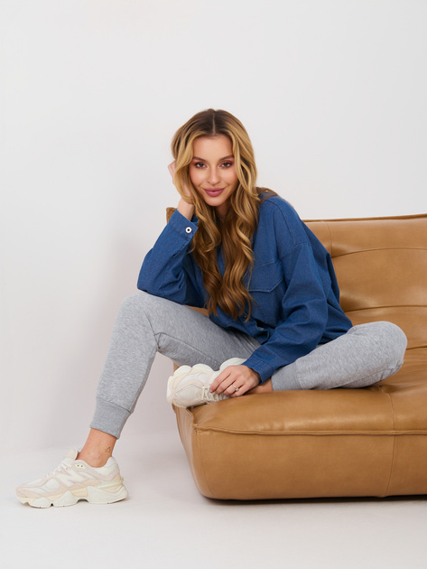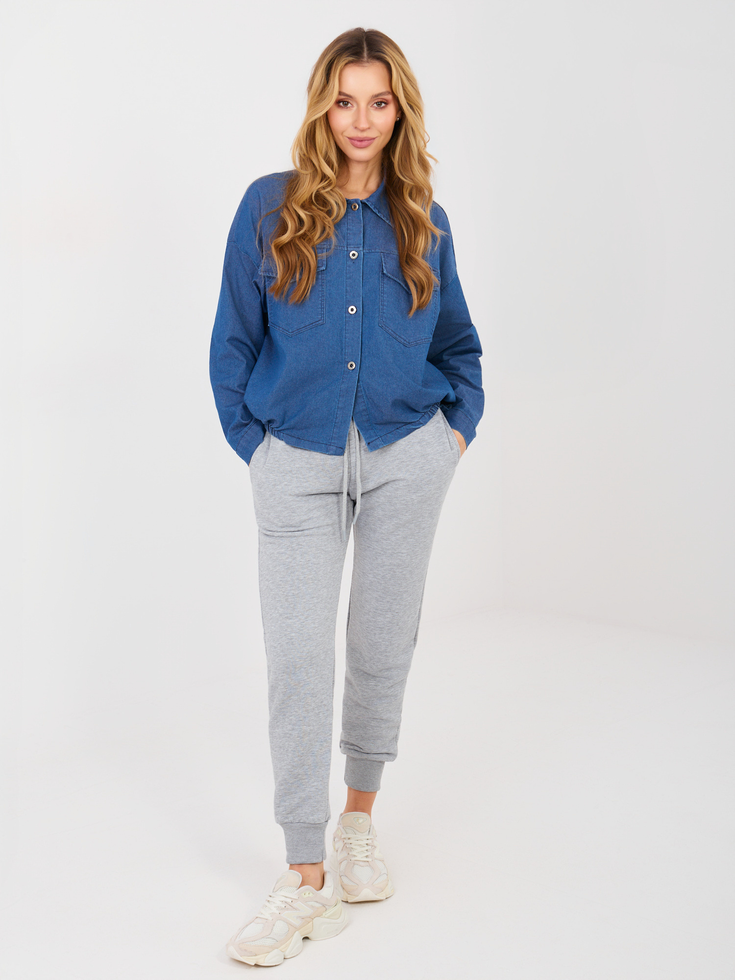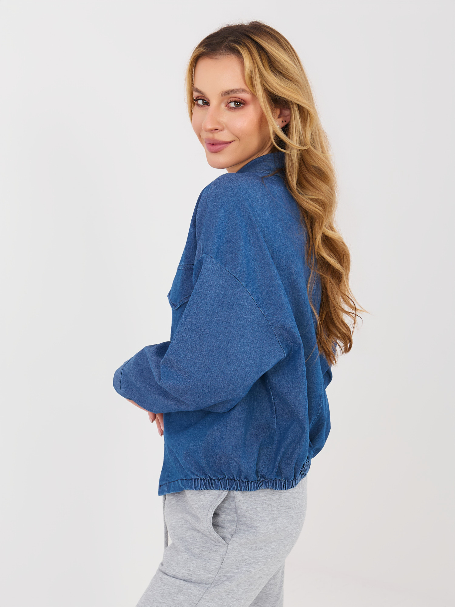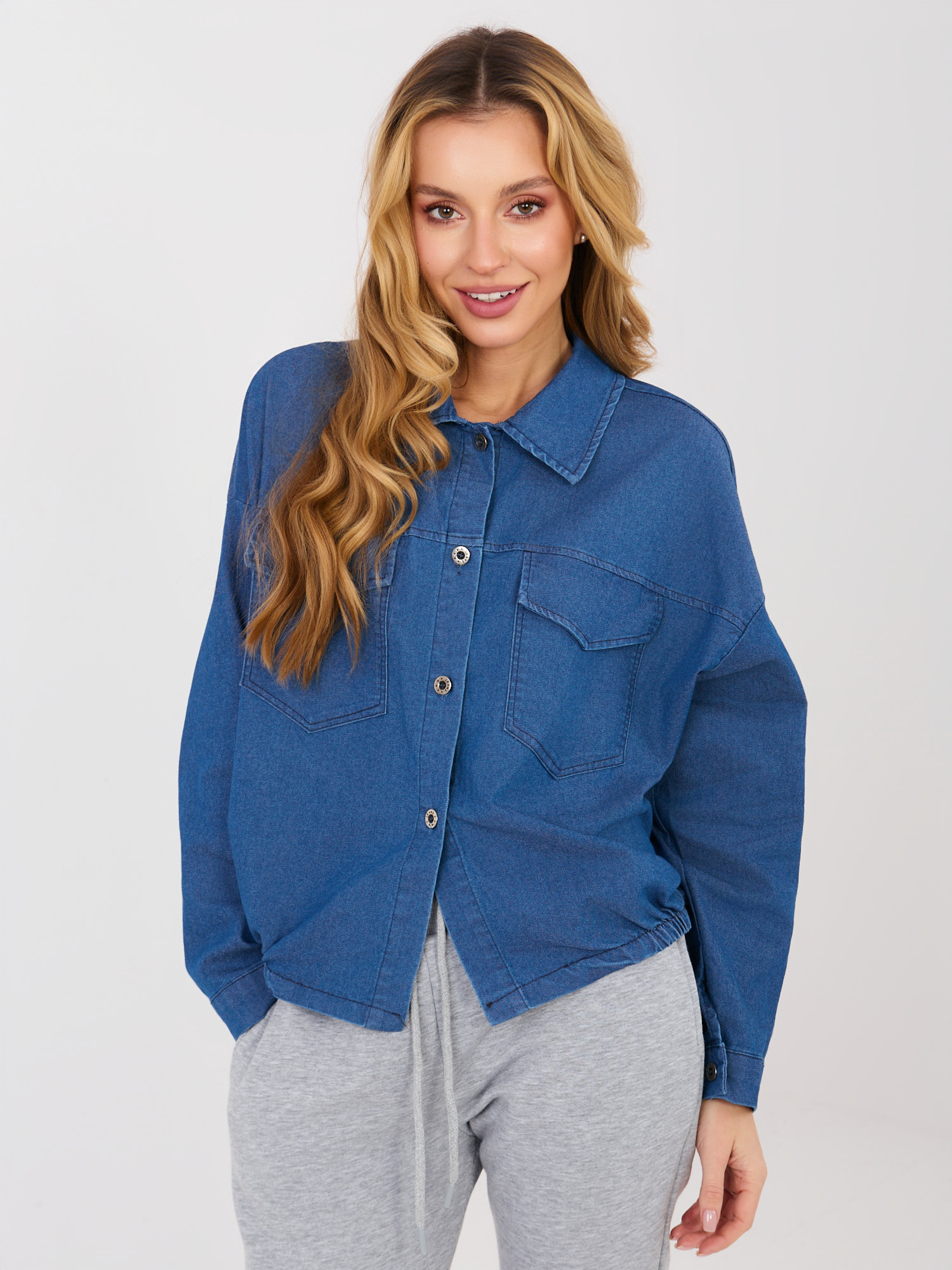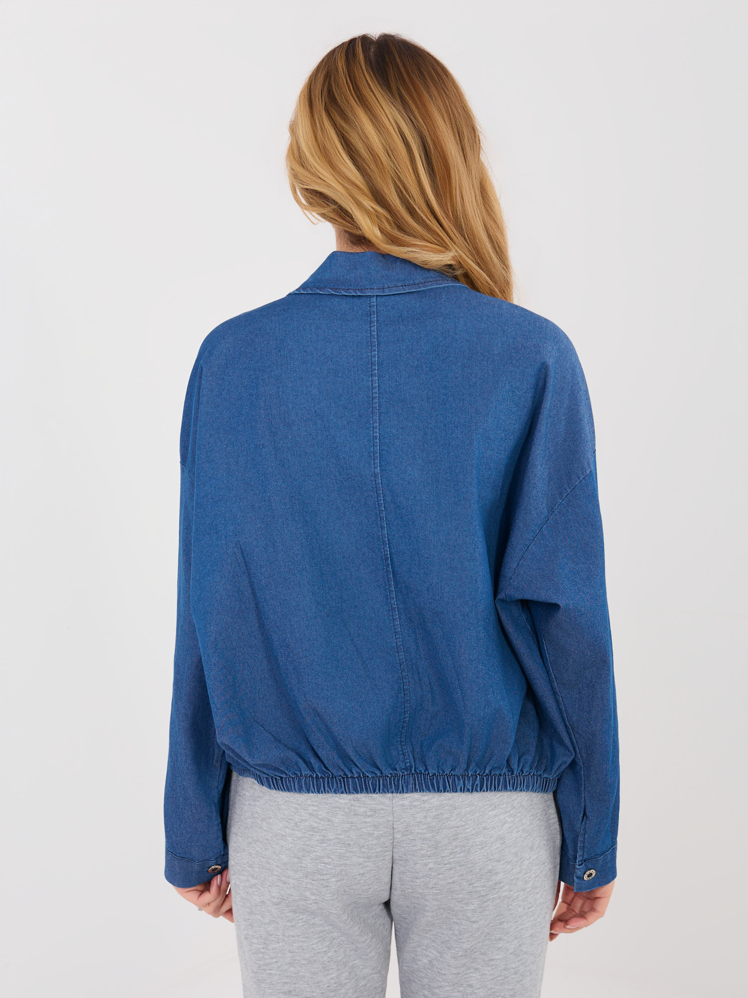 Niebieska jeansowa koszula ze ściągaczem na dole .