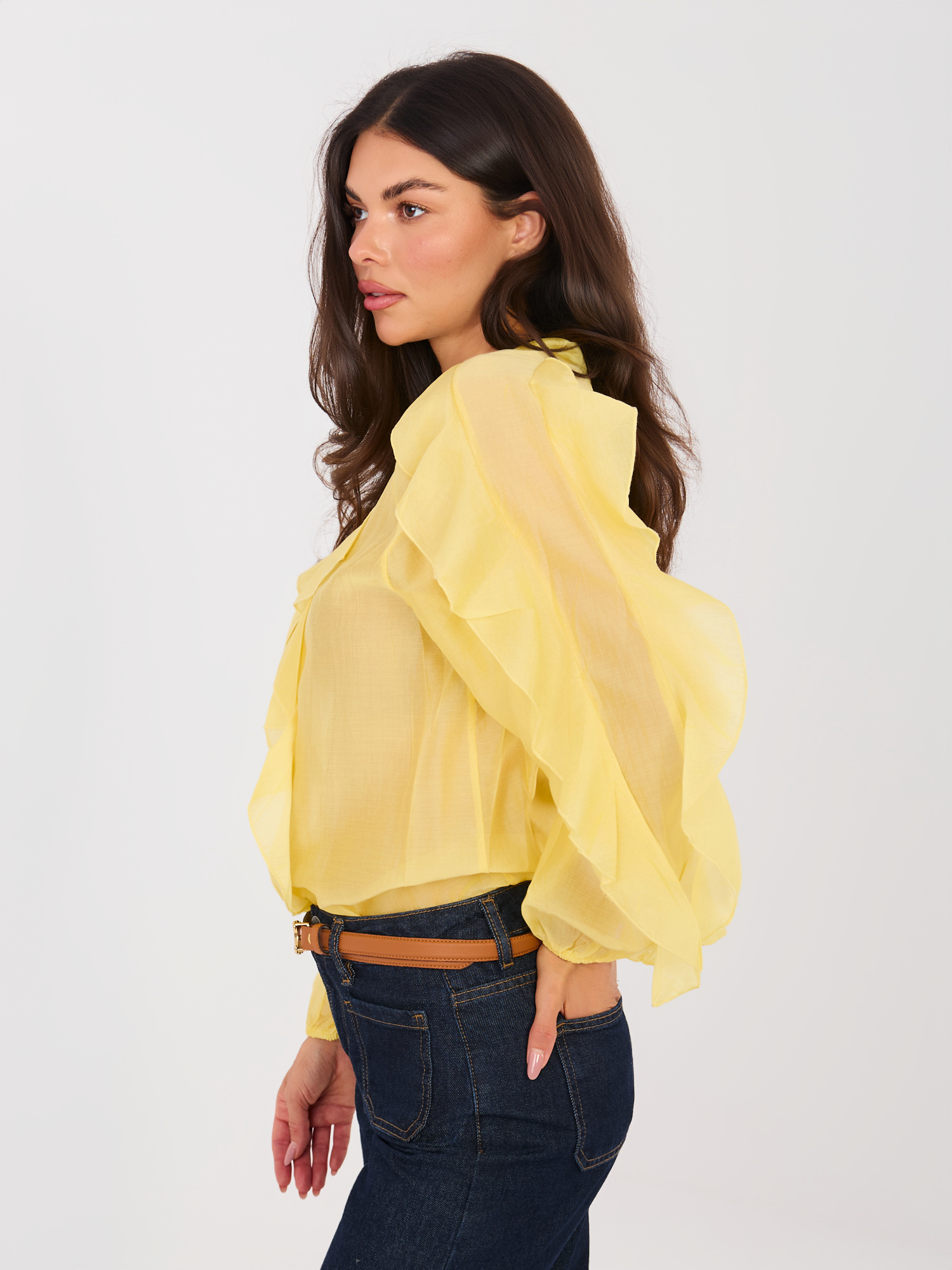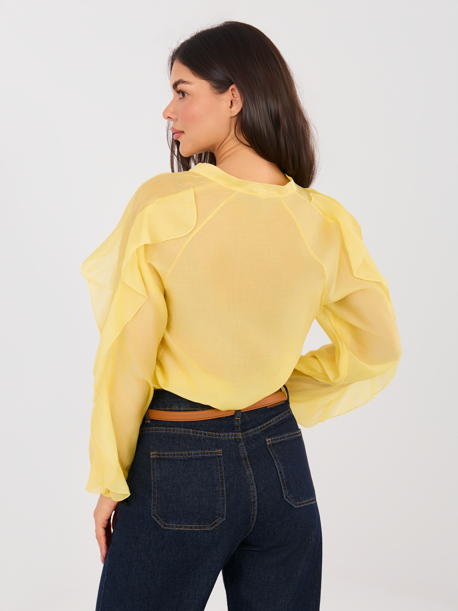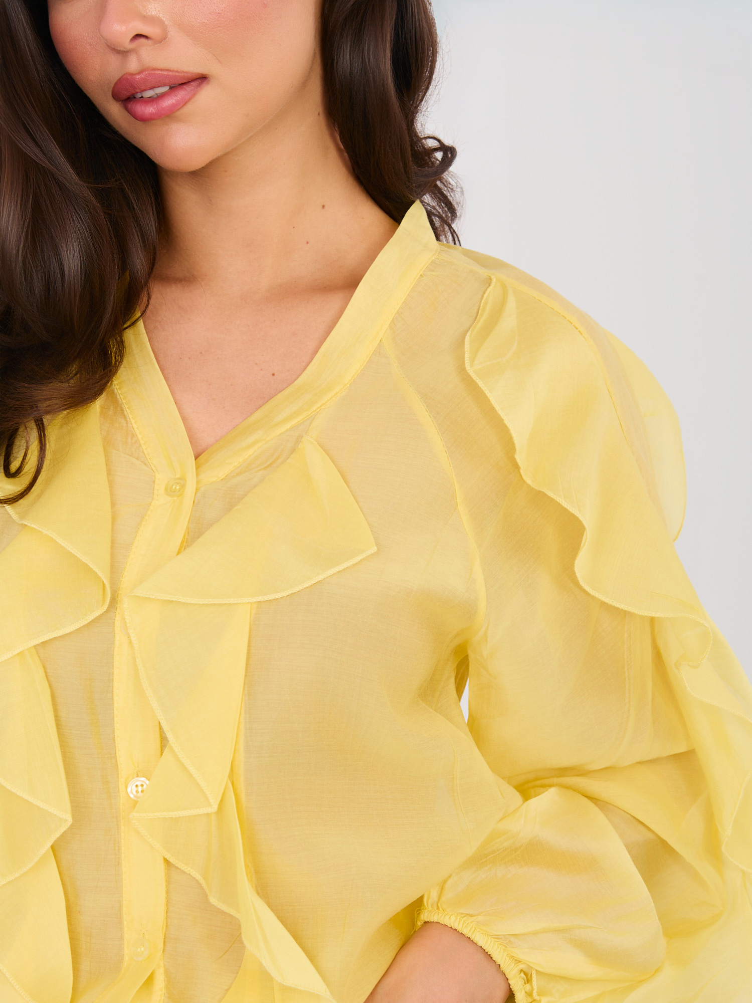 Żółta półprzezroczysta koszula z dekoltem V .