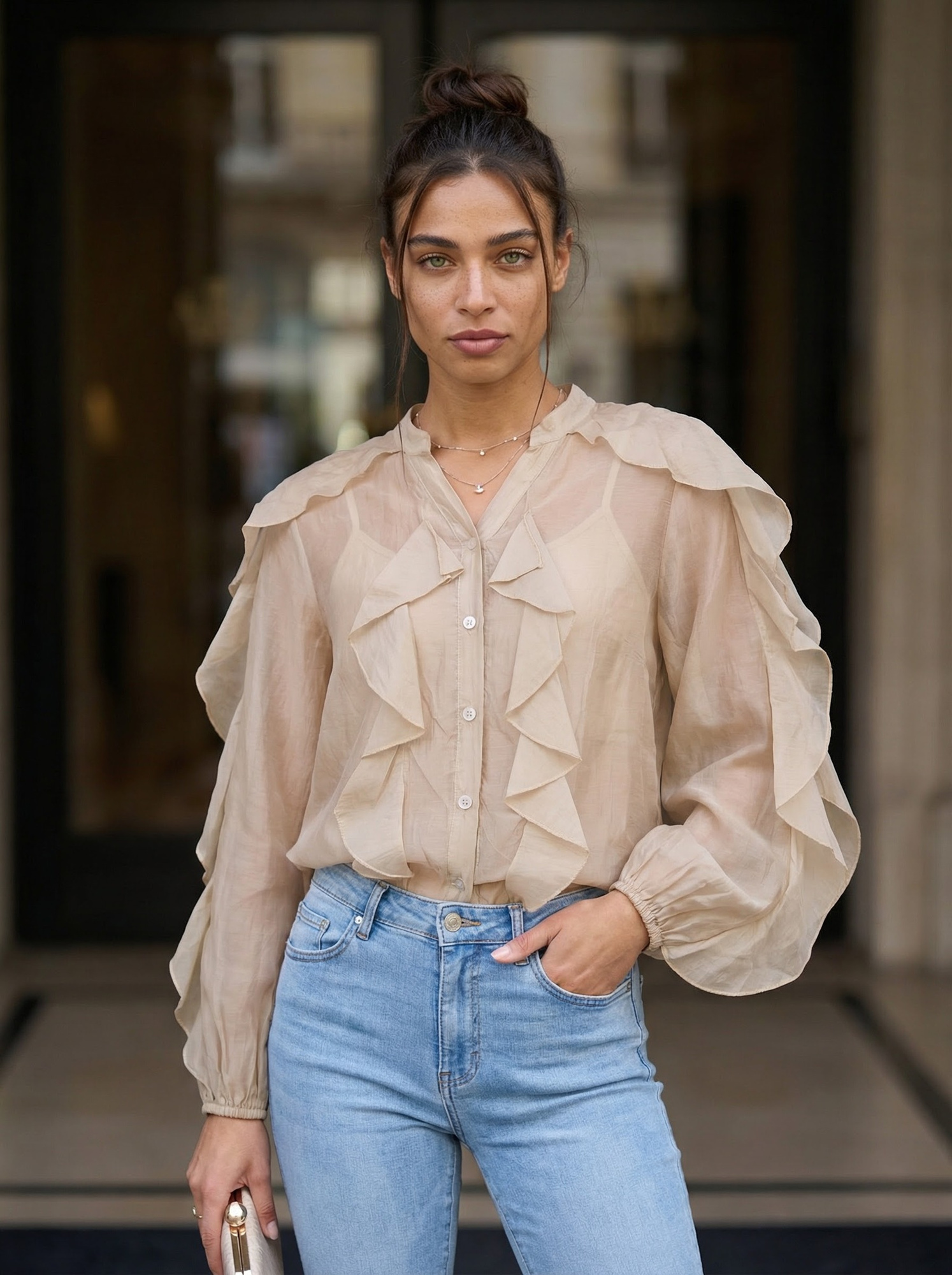 Beżowa elegancka koszula z bufiastym rękawem