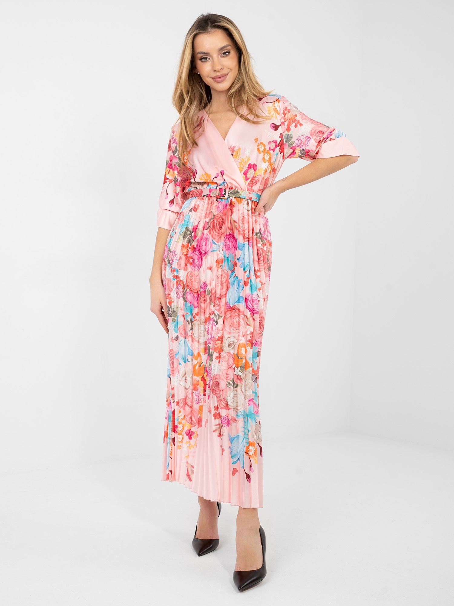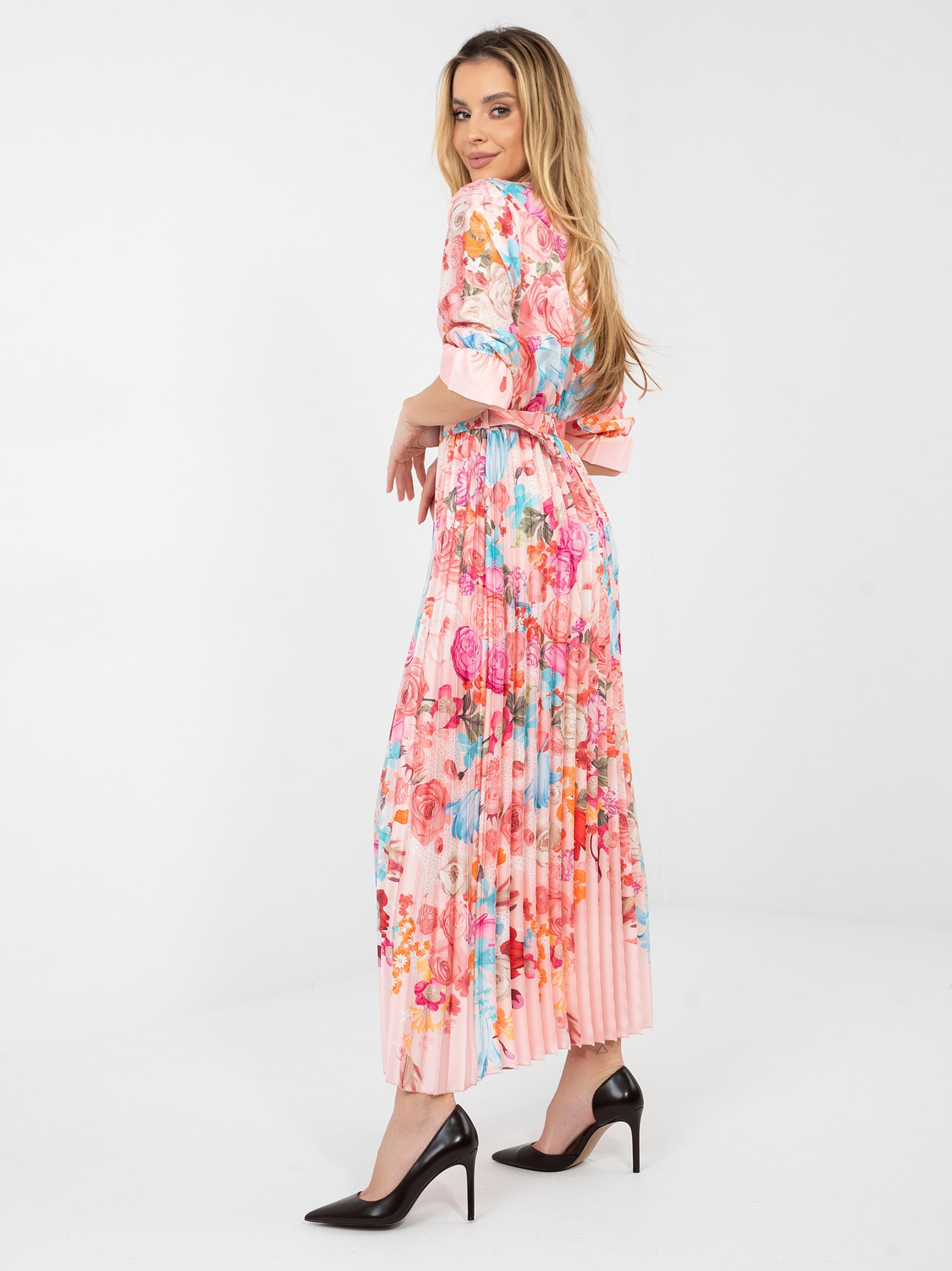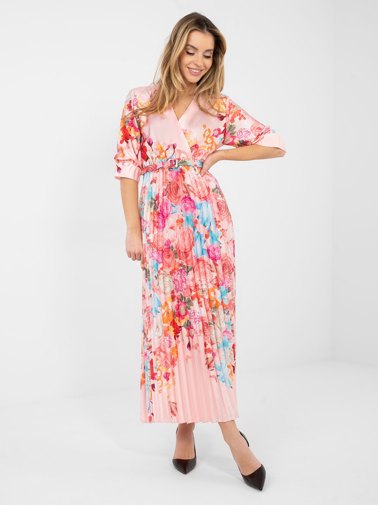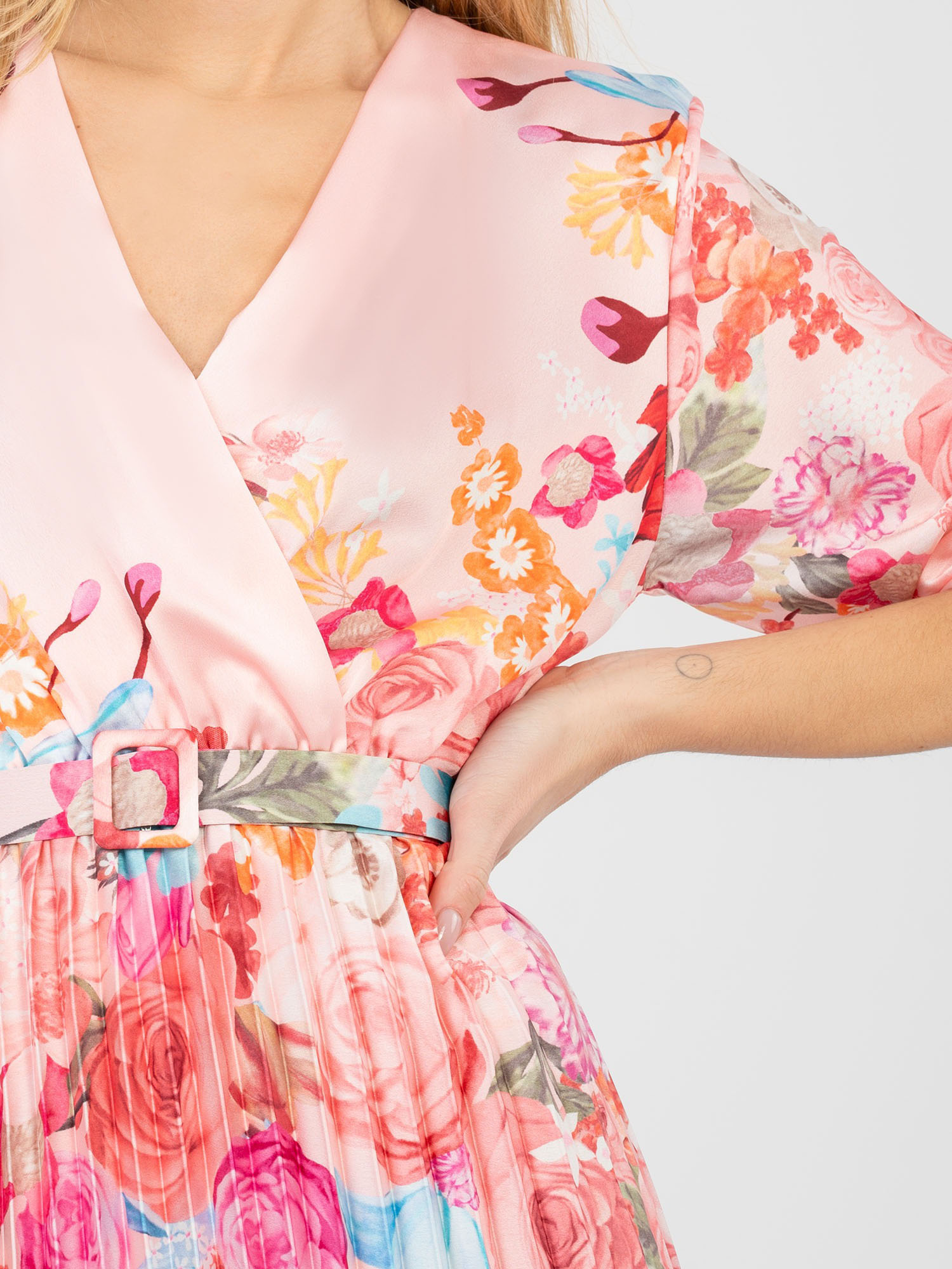 Jasnoróżowa satynowa sukienka w kwiaty