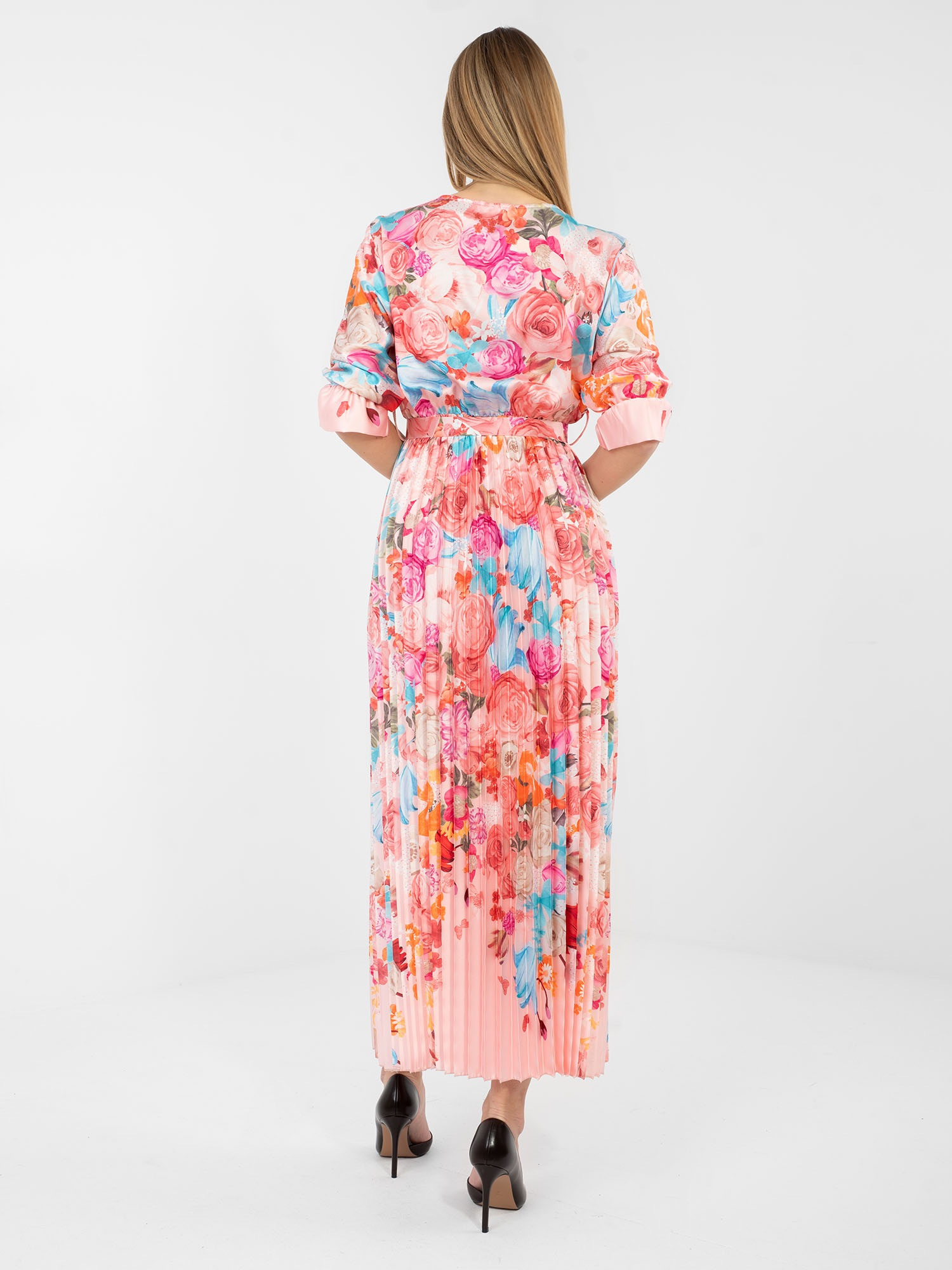 Jasnoróżowa satynowa sukienka w kwiaty .