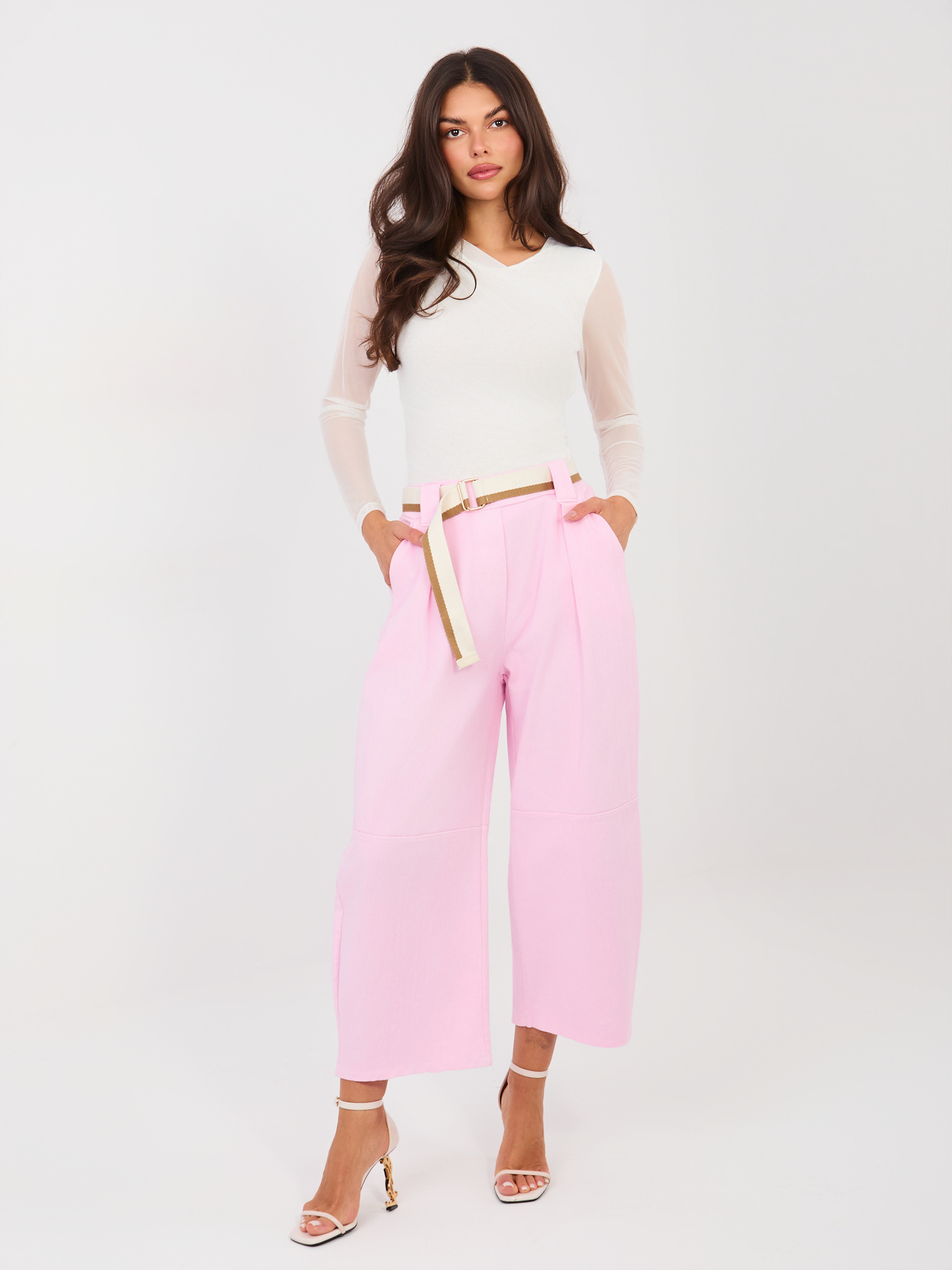 Jasnoróżowe jeansy z materiałowym paskiem RUE PARIS .