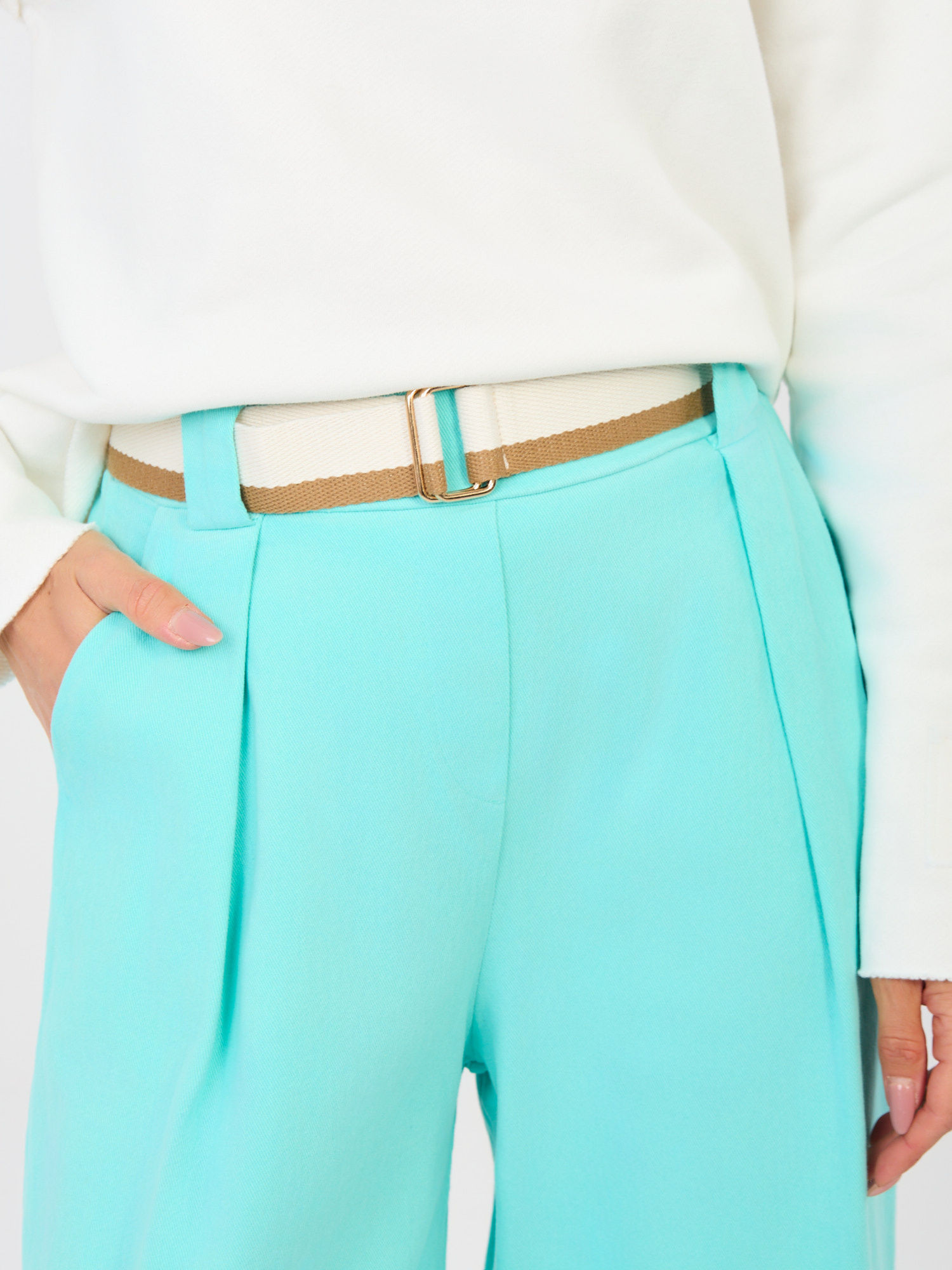 Turkusowe jeansowe spodnie z kieszeniami RUE PARIS .
