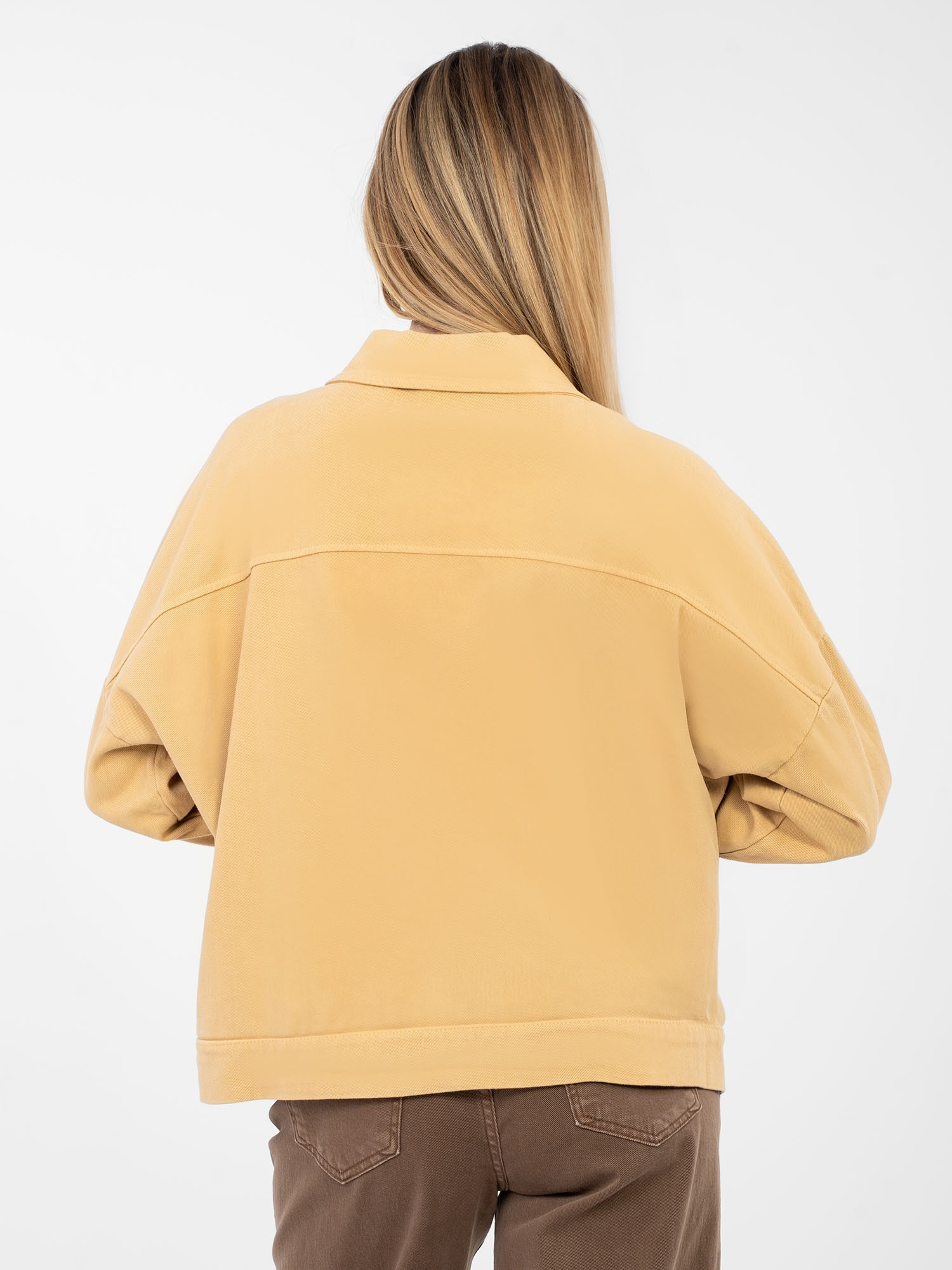 Camelowa jeansowa kurtka z zapięciem na guziki RUE PARIS .