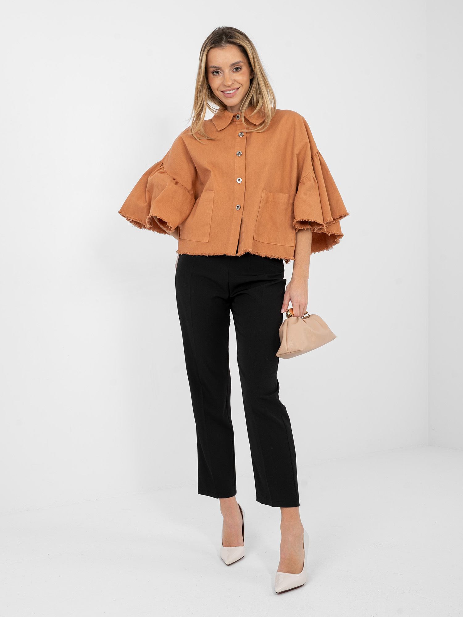 Ceglasta jeansowa kurtka z rękawem 3/4 RUE PARIS .