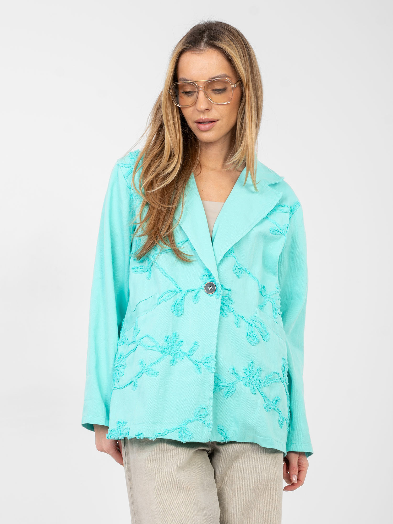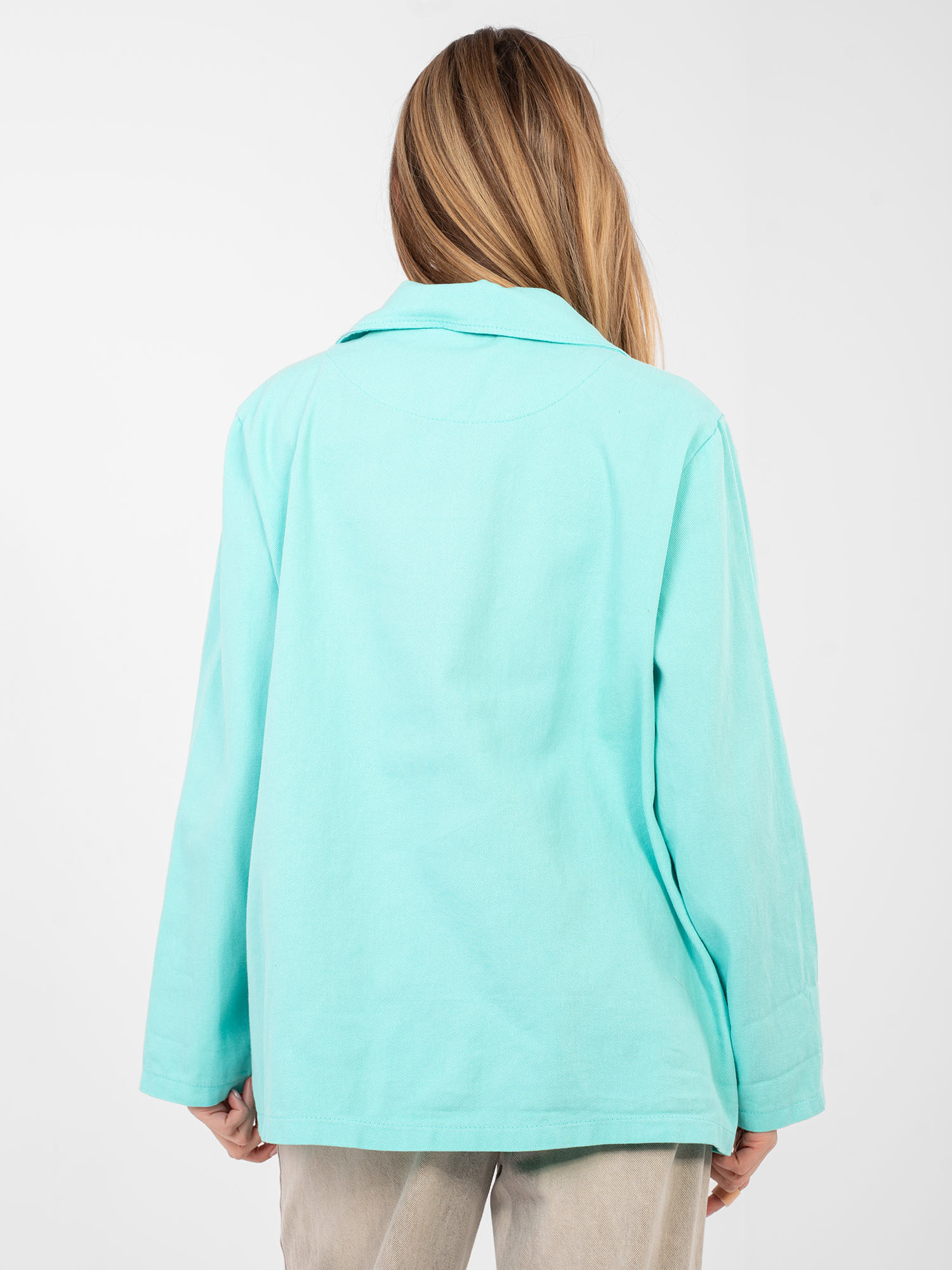 Turkusowa jeansowa marynarka z zapięciem na guzik RUE PARIS .